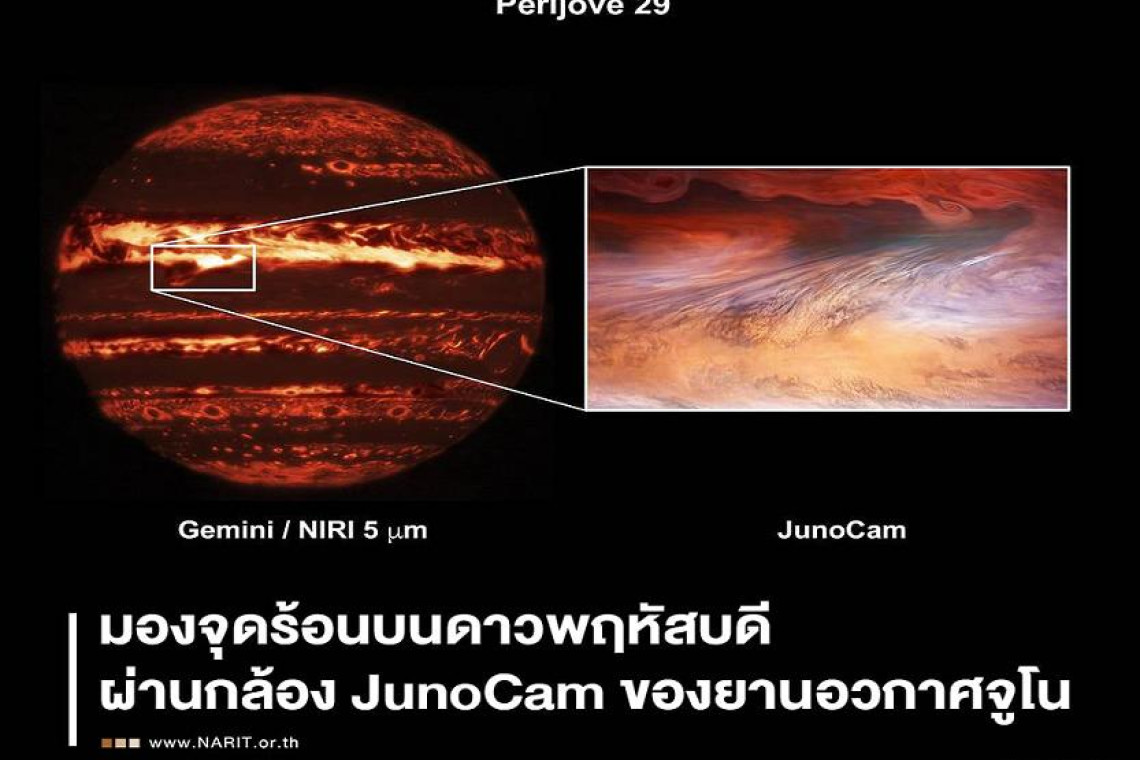 NARIT สถาบันวิจัยดาราศาสตร์แห่งชาติ โพสต์ผ่านเฟซบุ๊กระบุ “นักวิทยาศาสตร์เผยภาพจุดร้อน (Hot spot) บนบรรยากาศของดาวพฤหัสบดีที่ถ่ายด้วยกล้องถ่ายภาพ JunoCam ของยานอวกาศจูโน เปรียบเทียบกับภาพที่บันทึกได้จากกล้องโทรทรรศน์เจมิไนนอร์ท (Gemini North Telescope) ขนาดเส้นผ่านศูนย์กลาง 8.1 เมตร ที่ตั้งอยู่บนโลก จุดร้อนบนดาวพฤหัสบดี ค้นพบครั้งแรกโดยยานอวกาศกาลิเลโอ (Galileo) เมื่อวันที่ 7 ธันวาคม พ.ศ. 2538 เป็นบริเวณที่มีสีเข้มกว่าพื้นที่โดยรอบ แต่เมื่อศึกษาโดยกล้องโทรทรรศน์เจมิไนนอร์ทในช่วงคลื่นอินฟาเรด บริเวณดังกล่าวจะสว่างขึ้น ทำให้เห็นรายละเอียดของจุดร้อนที่ชัดเจนขึ้น และเมื่อใช้กล้อง JunoCam ของยานอวกาศจูโน ถ่ายภาพในบริเวณเดียวกันขณะที่ยานโคจรโฉบเข้าใกล้ดาวพฤหัสบดี ครั้งที่ 29 (Perijove 29) ทำให้เห็นแนวพายุสีดำแบบความละเอียดสูง ช่วยให้นักดาราศาสตร์สามารถศึกษากลไกการเกิดพายุและคลื่นบนดาวพฤหัสบดี รวมไปถึงจะช่วยไขปริศนาเรื่องน้ำที่อยู่ในชั้นบรรยากาศดาวพฤหัสบดีด้วย วัตถุท้องฟ้านั้นอยู่ไกลจากเรามาก การศึกษาให้ครบทุกแง่ทุกมุมในคราวเดียวนั้นเป็นไปได้ยาก นักดาราศาสตร์จึงจำเป็นต้องคิดค้นเครื่องมือและเทคนิคการเก็บข้อมูลหรือวิเคราะห์ข้อมูลที่มีความหลากหลาย จนกว่าจะได้ข้อมูลที่ชัดเจนและน่าเชื่อถือ เรียบเรียง : ธีรยุทธ์ ลอยลิบ - เจ้าหน้าที่สารสนเทศดาราศาสตร์ชำนาญการ หอดูดาวเฉลิมพระเกียรติ 7 รอบ พระชนมพรรษา สงขลา อ้างอิง : [1] https://www.nasa.gov/image-feature/jpl/a-hot-spot-on-jupiter [2] https://www.missionjuno.swri.edu/junocam/processing