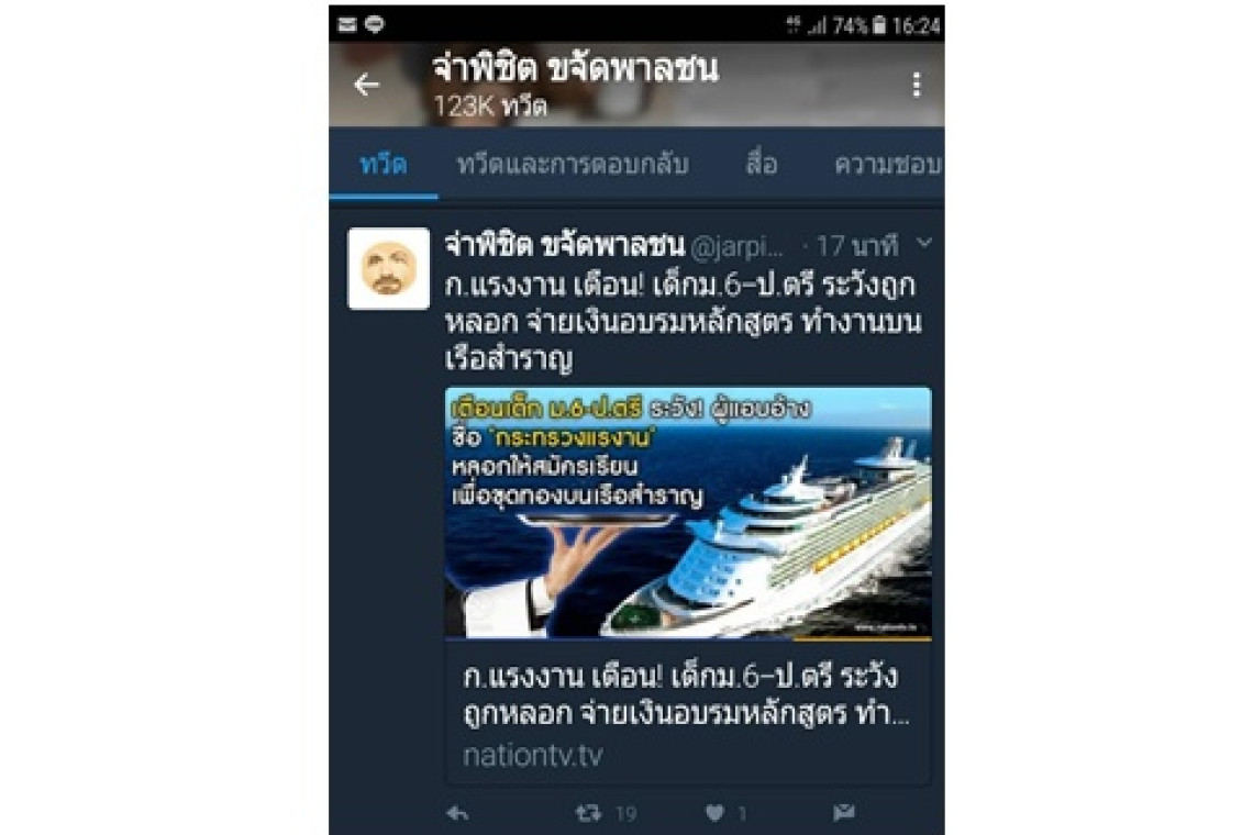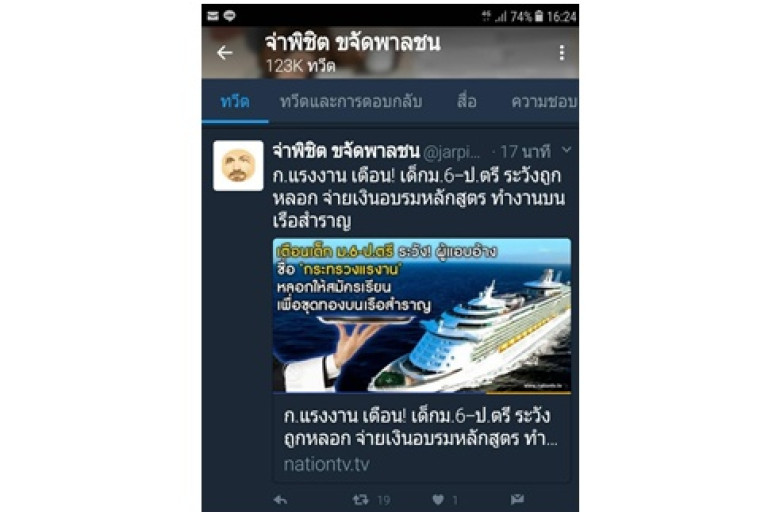 จากกรณีที่ กลุ่มมิจฉาชีพโพสต์ข้อความผ่านทาง Facebook และ Line ชักชวนคนหางานและสมาชิกที่เป็นบุคลากรทางการศึกษาให้ส่งบุตรหลานที่จบชั้นมัธยมศึกษาปีที่ 6 – ปริญญาตรี อายุระหว่าง 21-33 ปี เข้าร่วมโครงการฝึกอบรมหลักสูตรการทำงานบริการบนเรือสำราญในต่างประเทศ เป็นเวลา 6 เดือนกับโรงเรียนเอกชนในกรุงเทพมหานคร และจังหวัดต่าง ๆ เช่น ตรัง สงขลา ภูเก็ต นครศรีธรรมราช นครราชสีมา กำแพงเพชร เป็นต้น โดยอ้างว่าอยู่ในความควบคุมของกระทรวงแรงงาน และเมื่อเรียนจบแล้วจะได้รับการบรรจุเข้าทำงานบนเรือสำราญ มีรายได้ขั้นต่ำไม่น้อยกว่า 34,000 - 70,000 บาทต่อเดือน ไม่รวมทิป ซึ่งจะเก็บค่าสมัครเบื้องต้น 1,000 บาท ค่าชุดยูนิฟอร์ม 8,000 บาท โดยก่อนเข้าอบรมต้องจ่าย 20,000 บาท ระหว่างเรียน 10,000 บาท และก่อนเรียนจบอีก 20,000 บาท รวมค่าใช้จ่ายทั้งสิ้น 59,000 บาท โดยจะจัดหาที่พักให้ฟรีในระหว่างเรียน ซึ่งหากผู้ใดสนใจให้สมัครได้ตามสถานที่ต่างๆ ที่กำหนด นั้น