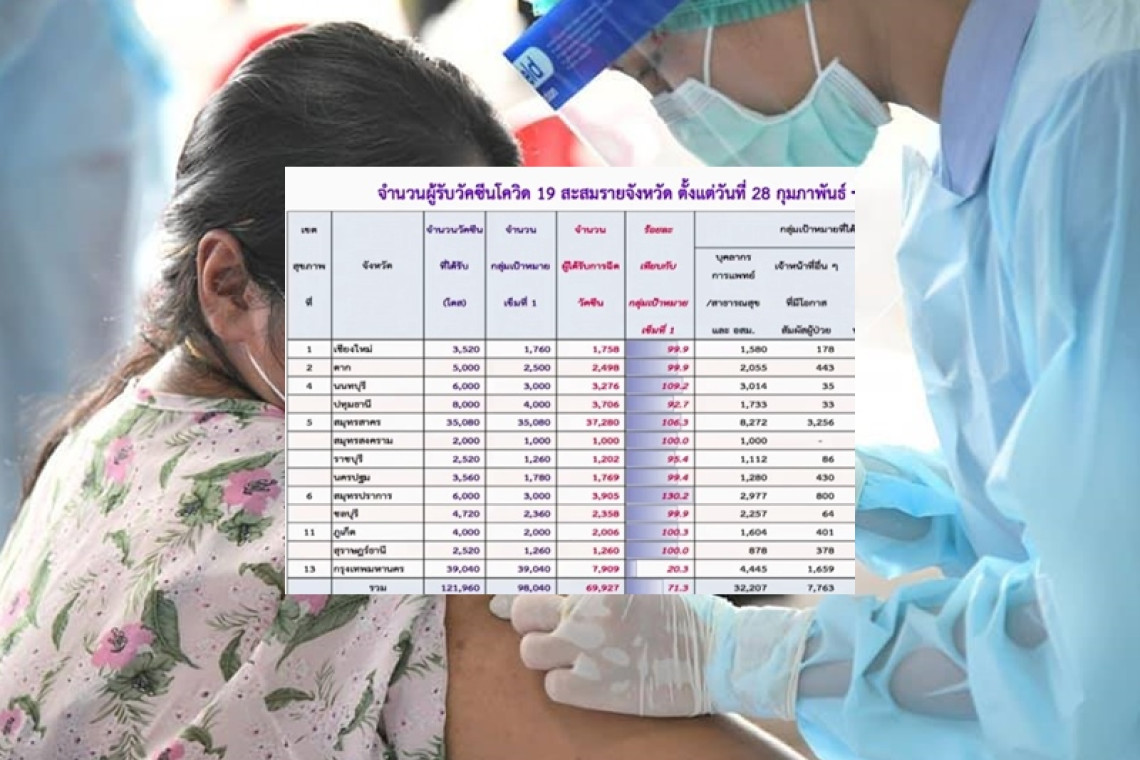 สำหรับจำนวนผู้ได้รับวัคซีนสะสม (28 ก.พ.-20 มี.ค.64) อยู่ที่ 69,927 ราย (ข้อมูล ณ วันที่ 20 มี.ค.64 เวลา 18.00 น. แบ่งเป็นบุคลากรการแพทย์/สาธารณสุข และอสม. 32,207 ราย เจ้าหน้าที่อื่นๆ ที่มีโอกาสสัมผัสผู้ป่วย 7,763 ราย บุคคลที่มีโรคประจำตัว 5,122 ราย ผู้สูงอายุ 60 ปีขึ้นไป 1,514 ราย และประชาชนในพื้นที่เสี่ยง 23,321 ราย โดยอาการข้างเคียงส่วนใหญ่ที่พบไม่ได้มีผลข้างเคียงรุนแรง บางรายที่อาการรุนแรงได้มีการดูแลและปลอดภัยดีแล้ว ซึ่งเกือบทุกจังหวัดฉีดวัคซีนได้ตามเป้าร้อยเปอร์เซ็นต์ หลายจังหวัดฉีดได้เกินร้อยเปอร์เซ็นต์ ยกเว้นกทม.ที่ยังฉีดได้เพียงร้อยละ 20 ซึ่งได้มีการปรับแผนการฉีดเชิงรุกให้ประชาชน ซึ่งคาดต่อไปจะมียอดการฉีดเพิ่มขึ้น