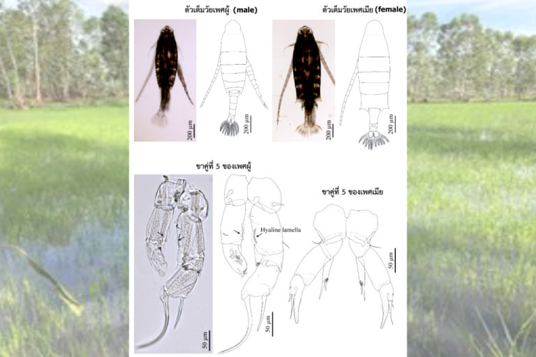 ม.เกษตร พบอีก "โคพีพอด" สกุล "Tropodiaptomus" ชนิดใหม่ของโลก บ่งชี้ว่าประเทศไทยเป็นแหล่งที่มีความหลากหลายของโคพีพอดสูงมาก คณะนักวิจัยมหาวิทยาลัยเกษตรศาสตร์ ได้แก่ นางสาวธนิดา แซ่ตั้ง นิสิตระดับปริญญาเอก สาขาวิชาสัตววิทยา ภาควิชาสัตววิทยา คณะวิทยาศาสตร์ มหาวิทยาลัยเกษตรศาสตร์ รองศาสตราจารย์ ดร.สุปิยนิตย์ ไม้แพ ภาควิชาสัตววิทยา คณะวิทยาศาสตร์ มหาวิทยาลัยเกษตรศาสตร์ อาจารย์ที่ปรึกษาวิทยานิพนธ์หลัก และศาสตราจารย์ ดร.ละออศรี เสนาะเมือง คณะวิทยาศาสตร์ มหาวิทยาลัยขอนแก่น อาจารย์ที่ปรึกษาวิทยานิพนธ์ร่วม ได้ร่วมกันค้นพบ "โคพีพอด" สกุล Tropodiaptomus ชนิดใหม่ของโลก บริเวณนาข้าวและสระน้ำ ใกล้แม่น้ำสงคราม จังหวัดบึงกาฬ ซึ่งนับว่าเป็นโคพีพอดสกุล Tropodiaptomus ที่พบได้ยากยิ่ง และบ่งชี้ว่าประเทศไทยเป็นแหล่งที่มีความหลากหลายของโคพีพอดสูงมาก รองศาสตราจารย์ ดร.สุปิยนิตย์ ไม้แพ เปิดเผยถึงที่มาของการค้นพบว่า เนื่องมาจากนางสาวธนิดา แซ่ตั้ง นิสิตระดับปริญญาเอก สาขาวิชาสัตววิทยา ได้ศึกษาวิทยานิพนธ์เรื่องการจัดระบบของสกุล Tropodiaptomus ที่พบในประเทศไทย ซึ่งเป็นสกุลที่มีปัญหาทางด้านอนุกรมวิธานและเป็นสกุลที่พบได้ยาก โดยทีมวิจัยได้สำรวจในพื้นที่ที่เคยมีรายงานการพบสกุลนี้ก่อนหน้า แต่แหล่งน้ำที่เคยรายงานการพบ Tropodiaptomus ชนิดหนึ่ง ใน จังหวัดบึงกาฬ หายไป ผู้วิจัยจึงได้เก็บตัวอย่างจากแหล่งน้ำใกล้เคียง (ภาพนาข้าว) หลังจากศึกษาลักษณะทางสัณฐานวิทยาจึงสามารถยืนยันได้ว่าตัวอย่างที่ได้เป็น โคพีพอดสกุลนี้และเป็นชนิดใหม่ของโลก งานวิจัยชิ้นนี้ ได้รับทุนวิจัยจากศูนย์ความเป็นเลิศด้านความหลากหลายทางชีวภาพ (BDC-PG4-161004) ทุนวิจัยระดับบัณฑิตศึกษา บัณฑิตวิทยาลัย มหาวิทยาลัยเกษตรศาสตร์ และทุนพัฒนาบัณฑิตศึกษาสำนักงานการวิจัยแห่งชาติ (วช.) โคพีพอดชนิดใหม่ของโลก มีชื่อวิทยาศาสตร์ว่า Tropodiaptomus megahyaline Saetang, Sanoamuang & Maiphae, 2021 โดย specific epithet ตั้งจากลักษณะทางสัณฐานเฉพาะของชนิดนี้ คือ ขาคู่ที่ 5 ทั้งข้างซ้ายและขวาของเพศผู้ มี hyaline lamella ขนาดใหญ่ กล่าวคือ มีลักษณะเด่นในเพศผู้เต็มวัยที่แตกต่างจากชนิดอื่น คือ บริเวณขอบด้านในของปล้องเบซิส (Basis) ของขาคู่ที่ 5 ทั้งข้างซ้ายและขวา มี hyaline lamella ซึ่งมีขนาดใหญ่เห็นได้ชัดเจน เอ็กโซพอดปล้องที่ 2 ของขาคู่ที่ 5 ข้างขวาเป็นรูปสี่เหลี่ยมคางหมู โดยส่วนโคนของปล้องแคบกว่าส่วนปลาย และขอบด้านนอกบริเวณส่วนปลายของปล้องดังกล่าว มีหนามไฮยาไลน์รูปสามเหลี่ยม ซึ่งเห็นได้ชัดเจน จำนวน 1 อัน รวมถึงบริเวณขอบด้านในของปล้องเอ็กโซพอด (Exopod) ของขาคู่ที่ 5 ข้างซ้ายโค้ง มีรอยหยักคล้า