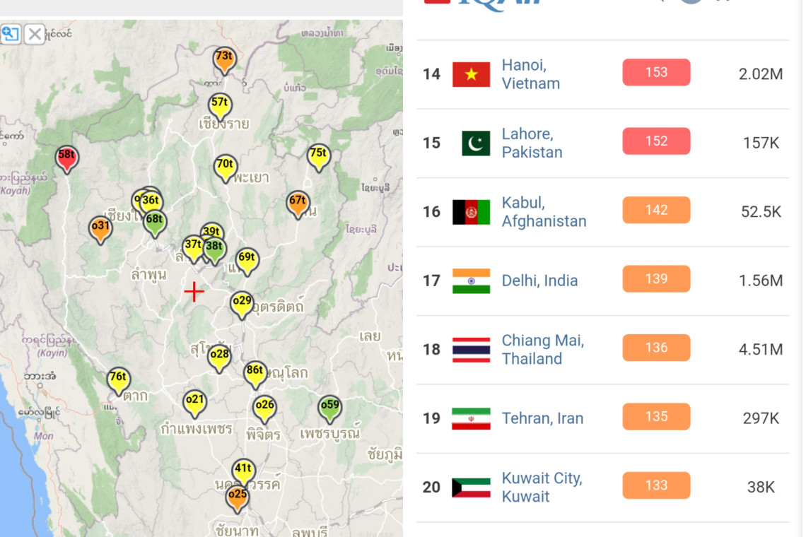 ด้าน www.iqair.com ซึ่งรายงานคุณภาพอากาศและจัดอันดับเมืองมลพิษโลก โดยรายงานแบบเรียลไทม์ วันที่ 25 มี.ค.64 เวลา 08.00 น. พบว่าเมืองเชียงใหม่อยู่ในลำดับที่ 18 ของโลก ดัชนีคุณภาพอากาศอยู่ที่ 136US AQI