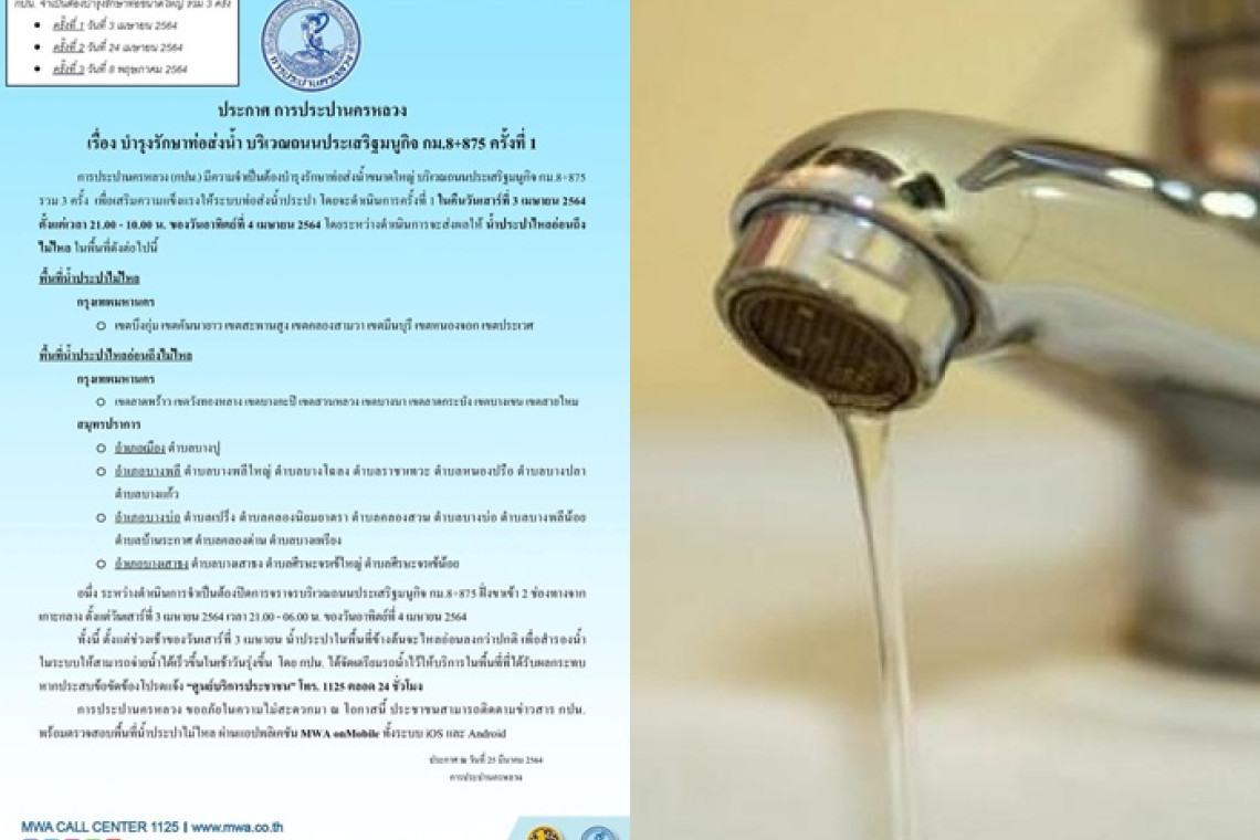 ดังนั้น จึงขอความร่วมมือลูกค้าในพื้นที่ สำรองน้ำไว้ใช้ในช่วงวันและเวลาดังกล่าว โดยน้ำประปาในพื้นที่ข้างต้น จะไหลอ่อนลงกว่าปกติ ตั้งแต่ช่วงเช้าของวันเสาร์ (ที่จะซ่อมท่อส่งน้ำประปา) เพื่อสำรองน้ำให้ระบบสามารถจ่ายน้ำได้เร็วขึ้นในช่วงเช้าของวันรุ่งขึ้น อย่างไรก็ตาม กปน. ได้จัดเตรียมรถน้ำไว้ให้บริการในพื้นที่ซึ่งได้รับผลกระทบ หากประสบข้อขัดข้องโปรดแจ้ง “ศูนย์บริการประชาชน” โทร. 1125 ตลอด 24 ชั่วโมง กปน. ขออภัยในความไม่สะดวกมา ณ ที่นี้ และขอขอบคุณในความร่วมมือเป็นอย่างดี เพื่อให้น้ำประปาของทุกท่านได้กลับมาให้บริการตามปกติโดยเร็ว ทั้งนี้ ประชาชนสามารถติดตามข่าวสาร กปน. พร้อมตรวจสอบพื้นที่น้ำประปาไม่ไหล ผ่านแอปพลิเคชัน MWA onMobile ทั้งระบบ iOS และ Android