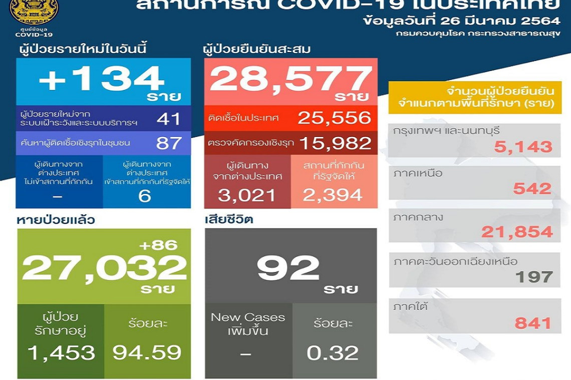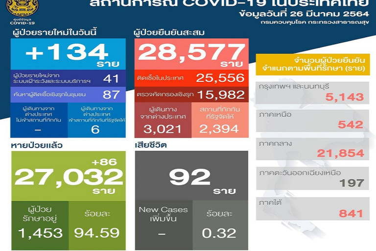 ติดเชื้อในประเทศ 128 ราย มาจากต่างประเทศอีก 6 พบผู้ติดเชื้ออายุน้อยสุด 1 ขวบถึง 2 ราย มากสุด 83 ปี ขณะกทม.พบผู้ป่วยติดเชื้อสูงสุด 98 ราย เป็นคนเมียนมาถึง 59 ราย คนไทย 38 และลาว 1 เมื่อวันที่ 26 มี.ค.64 ศูนย์บริหารสถานการณ์โควิด-19 ได้รายงานสถานการณ์ผู้ป่วยติดเชื้อโควิด-19 ในประเทศไทย ซึ่งล่าสุดพบผู้ติดเชื้อรายใหม่ 134 ราย (เป็นการติดเชื้อภายในประเทศ 128 ราย มาจากต่างประเทศ 6 ราย ) ยอดป่วยสะสม 28,577 ราย ไม่มีผู้เสียชีวิตเพิ่ม โดยยอดเสียชีวิตสะสมยังอยู่ที่ 92 ราย รักษาหายเพิ่มอีก 86 ราย รวมยอดผู้ป่วยรักษาหาย 27,032 ราย และยังคงรักษาตัวอยู่ในโรงพยาบาล 1,453 ราย ทั้งนี้ พบผู้ป่วยติดเชื้อในกทม.สูงสุดที่ 98 ราย สำหรับผู้ป่วยรายใหม่ 134 ราย เป็นการติดเชื้อภายในประเทศ 128 ราย (โดยมาจากระบบเฝ้าระวังและระบบบริการฯ 41 ราย จากการค้นหาผู้ติดเชื้อเชิงรุกในชุมชน 87 ราย) และเดินทางมาจากต่างประเทศอีก 6 ราย โดยเป็นคนไทย 4 ราย สัญชาติซิมบับเว 1 ราย สวีเดน 1 ราย เดินทางมาจากมาเลเซีย 1 ราย ซิมบับเว 1 ราย สวีเดน 2 ราย เกาหลีใต้ 1 ราย และตุรกี 1 ราย ทั้งหมดได้ผ่านการคัดกรองและเข้าพักในสถานที่กักกันที่รัฐจัดไว้ให้แล้ว ผู้ป่วยในประเทศไทยรายใหม่พบอายุน้อยสุด 1 ขวบ จำนวน 2 รายที่กทม. และจ.สมุทรปราการ ขณะอายุุมากที่สุด 83 ปี ที่กทม. พบการติดเชื้อในประเทศจากระบบเฝ้าระวังฯ 41 ราย ในกทม.16 ราย เป็นคนไทยทั้งหมด ตาก 5 ราย ชาวเมียนมาทั้งหมด สมุทรปราการ 5 ราย คนไทยท้ังหมด สมุทรสาคร 15 ราย เป็นคนไทย 3 เมียนมา 12 และจากการคัดกรองเชิงรุกในชุมชน 87 ราย พบในกทม.83 ราย แบ่งเป็นคนไทย 22 เมียนมา 59 ลาว 1 ปทุมธานี 1 ราย เป็นชาวเมียนมา สมุทรสงคราม 2 ราย คนไทยทั้งหมด และสมุทรสาคร 2 ราย เป็นชาวเมียนมา