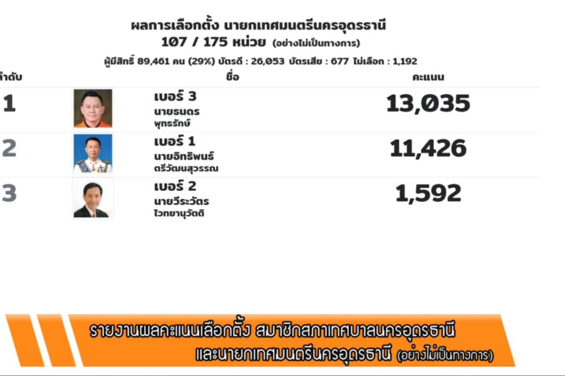 ผู้สื่อข่าวรายงานว่า ผลการนับคะแนนอย่างไม่เป็นทางการของการเลือกตั้งนายกเทศมนตรีเทศบาลนครอุดรธานีและสมาชิกสภาเทศบาล ปรากฏว่า ขณะนี้ ดร.ธนดร พุทธรักษ์ ผู้สมัครชิงตำแหน่งนายกเทศมนตรีนครอุดรธานีมีคะแนนนำ ดร.ตุ๋ง นายอิทธิพนธ์ ตรีวัฒน์สุวรรณ อดีตนายกเทศมนตรีนครอุดรธานี แชมป์หลายสมัย