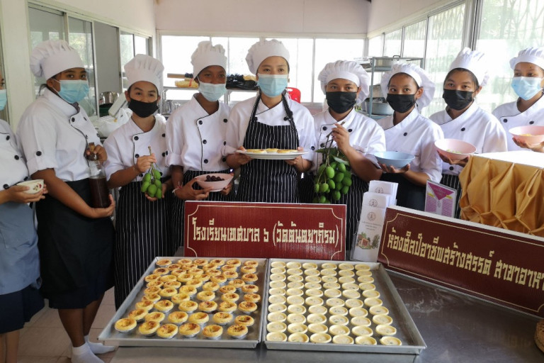 โดยการนำมะม่วงเบาซึ่งเป็นพืชผลไม้ประจำถิ่นภาคใต้ที่กำลังออกผลผลิตจำนวนมากขณะนี้ จนพบว่าล้นตลาดมีราคาตกต่ำ จึงได้นำมะม่วงเบาที่ปลูกไว้ในสวนเศรษฐกิจพอเพียงของโรงเรียน นำมาแปรรูปทำเป็น “ขนมทาร์ตไข่มะม่วงเบา” รสชาตินุ่มหอมหวานอมเปรี้ยวเล็กน้อย กลมกล่อมสุดอร่อยที่ลงตัว ขายผ่านสื่อออนไลน์ได้รับผลตอบรับดีเกินคาด ทำให้นักเรียนได้เรียนรู้วิธีการทำอาหารที่หลากหลาย เกิดความคิดสร้างสรรค์ สร้างรายได้ระหว่างเรียน และสามารถนำไปต่อยอดทำเป็นอาชีพได้ในอนาคต