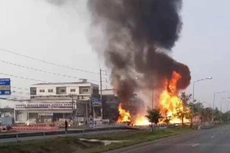 เมื่อเวลา 08.00 น. วันที่ 6 เม.ย. 64 พ.ต.ท.วิโรจน์ เจริญใจ สารวัตรเวร สภ.โพธาราม จ.ราชบุรี ได้รับแจ้งเหตุรถปิกอัพชนราวสะพานปูนแล้วเกิดเพลิงลุกไหม้ เหตุเกิดที่บริเวณถนนเพชรเกษม กม.ที่ 84 หมู่ 5 ต.บ้านสิงห์ อ.โพธาราม จึงประสานขอรถน้ำดับเพลิงจากเทศบาลตำบลบ้านสิงห์ ให้เข้าไปฉีดน้ำดับเพลิง ก่อนจะเดินทางไปตรวจสอบพร้อมหน่วยกู้ภัยสว่างราชบุรี ในที่เกิดเหตุพบเพลิงกำลังลุกไหม้รถ และจู่ๆก็เกิดระเบิดเสียงดังสนั่น เจ้าหน้าที่ดับเพลิงต้องฉีดน้ำในระยะไกล ใช้เวลานานกว่า 30 นาที จึงดับไฟที่ลุกไหม้รถได้ ตรวจสอบพบว่าเป็นรถปิกอัพ ยี่ห้อ โตโยต้า วีโก้ ไม่ทราบสี หมายเลขทะเบียน บษ - 977 พระนครศรีอยุธยา สภาพรถถูกไฟลุกไหม้เสียหายทั้งคัน ส่วนที่ด้านหลังรถนั้นบรรทุกยาฉีดกันยุงยี่ห้อ หนึ่ง ซึ่งเป็นกระป๋องสเปรย์ แรงระเบิดทำให้กระป๋องยาฉีดกันยุงปลิวกระจัดกระจายเกลื่อนถนน เจ้าหน้าที่ต้องทำการปิดการจราจรชั่วคราว เพื่อเคลียร์พื้นที่ ส่วนคนขับรถปิกอัพนั้นทราบว่าได้รับบาดเจ็บสาหัส ถูกนำตัวส่งโรงพยาบาลโพธาราม ไปก่อนหน้านี้แล้ว และเสียชีวิตในเวลาต่อมา ทราบชื่อคือนายภูวดล พลชำนาญ อายุ 19 ปี อยู่บ้านเลขที่ 48 / 53 หมู่ 3 ต.พิมลลาศ อ.บางบัวทอง จ.นนทบุรี