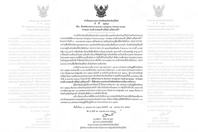 ผู้สื่อข่าวรายงานว่า เพจเฟซบุ๊ก ลุงเนวิน ของ เนวิน ชิดชอบ ประธานที่ปรึกษาสนามช้างอินเตอร์เนชั่นแนลเซอร์กิต โพสต๋ข้อความระบุว่า... สำนึกต่อส่วนรวม คณะกรรมการโรคติดต่อประจำจังหวัดบุรีรัมย์ มีมติยกเลิกการจัดกิจกรรมสงกรานต์ บุรีรัมย์ เนื่องจากมีการตรวจพบผู้ติดเชื้อโควิดในจังหวัดบุรีรัมย์ 2 ราย ที่จะมาร่วมกิจกรรม และ มีการติดเชื้อในกลุ่มศิลปิน ซึ่งมาจากสถานบันเทิงบางแห่ง และมีศิลปินหลายคนกักตัวแล้ว คณะกรรมการโรคติดต่อประจำจังหวัดบุรีรัมย์ พิจารณาแล้ว มีมติให้ยกเลิกการจัดงาน แม้จะได้ปฏิบัติตามมาตรการของสาธารณสุขอย่างเคร่งครัดแล้วก็ตาม ทั้งนี้เพื่อความปลอดภัยของประชาชนชาวบุรีรัมย์ ทุกคน ในส่วนของสโมสรบุรีรัมย์ ยูไนเต็ด ซึ่งเป็นผู้ประสานงานผู้สนับสนุนจัดกิจกรรม ต้องกราบขออภัยทุกท่าน ที่ไม่สามารถจัดกิจกรรมตามที่ได้เชิญทุกท่านมาร่วมงานได้ตามที่ได้เตรียมงานร่วมกัน #เจ็บแต่จบ
