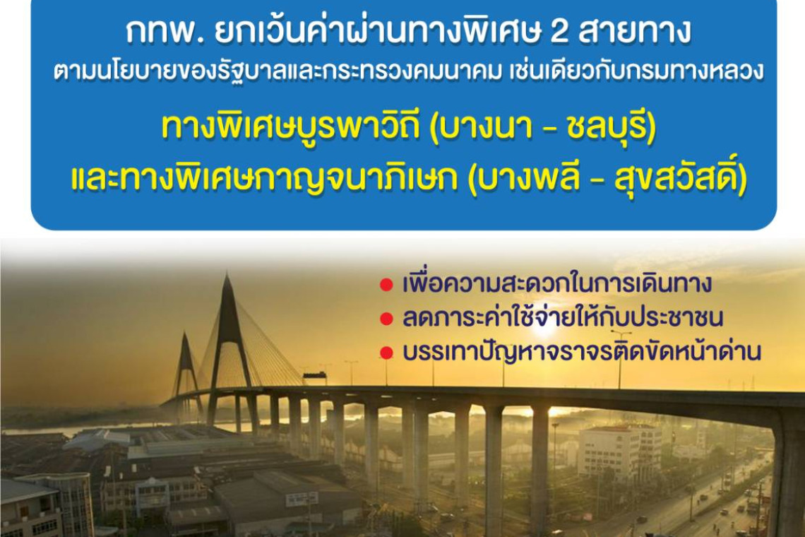 ทั้งนี้ ผู้ใช้ทางสามารถสอบถามข้อมูลการเดินทาง สภาพการจราจร และขอความช่วยเหลือจากศูนย์ข้อมูลผู้ใช้ทางพิเศษ EXAT Call Center โทร 1543 และผู้ใช้ทางพิเศษสามารถดาวน์โหลด Application "EXAT Portal"