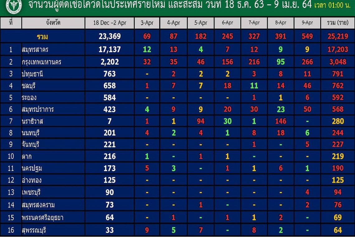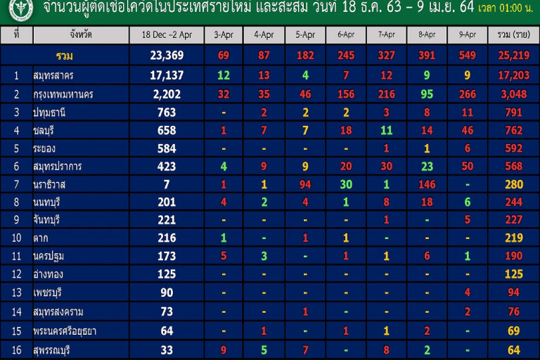 อันดับ 1 สมุทรสาคร รายใหม่เพิ่ม 9 ยอดรวม 17,203 ราย (เพิ่มเท่ากับเมื่อวานที่ 9 ราย)