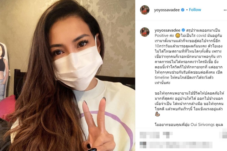 "สรุปว่าผลออกมาเป็น Positive ค่ะ ?ไม่เป็นไร covid มันอยู่กับเรามาตั้งนานแล้วก็จะขอสู้ต่อไปจากนี้อีก 10กว่าวันแล้วมารอดูผลกันนะคะ ตัวโยเองไม่ได้โทษสถานที่ที่ไหนใดๆทั้งสิ้น เพราะเชื่อว่าทุกคนก็เจอหนักหนามาพอๆกัน เราคาดการณ์ไม่ได้หรอกคะว่าใครมีเชื้อ ยิ่งตอนนี้เจ้าโควิดก็ไปทักทายทุกที่ แต่อยากให้ทุกๆคนช่วยกันรับผิดชอบต่อสังคม เปิด timeline ให้คนใกล้ชิดเราได้ระวังตัวเท่านั้นค่ะ
