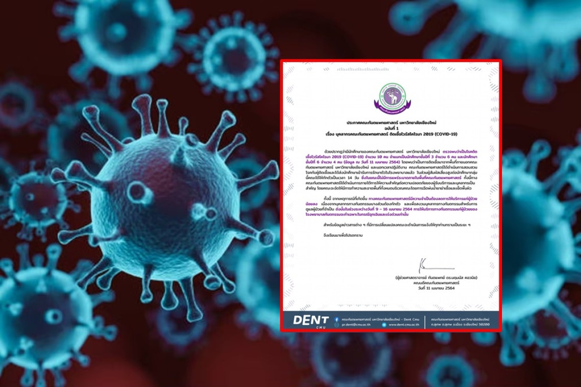 ด้วยปรากฏว่ามีนักศึกษาของคณะทันตแพทยศาสตร์ มหาวิทยาลัยเชียงใหม่ ตรวจพบว่าเป็นโรคติดเชื้อไวรัสโคโรนา 2019 (COVID-19) จำนวน 10 คน (ข้อมูล ณ วันที่ 11 เมษายน 2564) โดยพบว่าเป็นการติดเชื้อมาจากพื้นที่ภายนอกคณะทันตแพทยศาสตร์และนอกเวลาปฏิบัติงาน  คณะทันตแพทยศาสตร์ได้ดำเนินการสอบสวนโรคกับผู้ติดเชื้อและได้ส่งนักศึกษาเข้ารับการรักษาตัวในโรงพยาบาลแล้ว ในส่วนผู้สัมผัสเสี่ยงสูงต่อนักศึกษากลุ่มนี้คณะได้ให้กักตัวเป็นเวลา 14 วัน ซึ่งในขณะนี้ไม่มีการแพร่ระบาดภายในพื้นที่คณะทันตแพทยศาสตร์ ทั้งนี้คณะจะจัดให้มีการทำความสะอาดพื้นที่ทั้งหมดบริเวณคณะโดยการฉีดพ่นน้ำยาฆ่าเชื้อและเช็ดพื้นผิวเพื่อความมั่นใจต่อผู้เข้ามารับบริการด้วยมาตรฐานสูงสุด