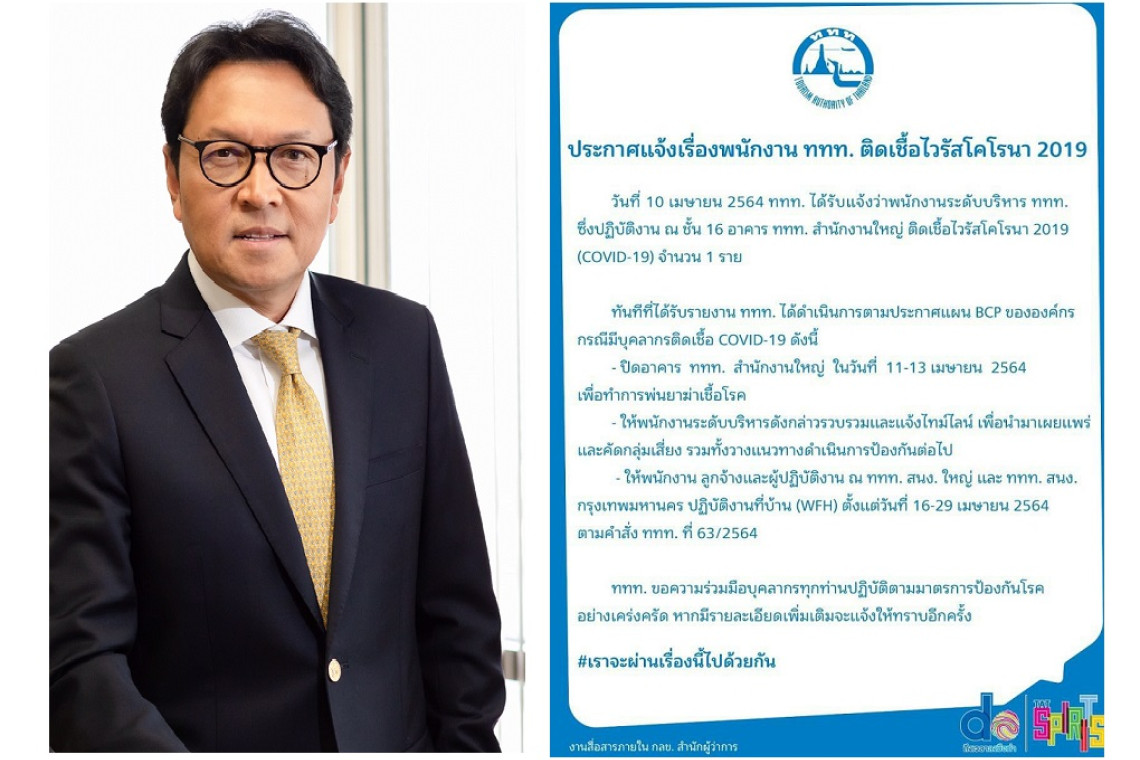 วันที่ 11 เมษายน 2564 การท่องเที่ยวแห่งประเทศไทย (ททท.) ออกประกาศว่า เมื่อวันที่ 10 เมษายน 2564 ได้รับแจ้งว่า พนักงานระดับบริหาร ททท. ซึ่งปฏิบัติงาน ณ ชั้น 16 อาคาร ททท. สำนักงานใหญ่ ติดเชื้อไวรัสโคโรนา 2019 (COVID-19) จำนวน 1 ราย ทันทีที่ได้รับรายงาน ททท.ได้ดำเนินการตามประกาศแผน BCP ขององค์กร กรณีมีบุคลากรติดเชื้อ COVID-19 ดังนี้ 1.ปิดอาคาร ททท. สำนักงานใหญ่ ในวันที่ 11-13 เมษายน 2564 เพื่อทำการพ่นยาฆ่าเชื้อโรค 2.ให้พนักงานระดับบริหารดังกล่าวรวบรวมและแจ้งไทม์ไลน์ เพื่อนำมาเผยแพร่และคัดกลุ่มเสี่ยง รวมทั้งวางแนวทางดำเนินการป้องกันต่อไป 3.ให้พนักงาน ลูกจ้าง และผู้ปฏิบัติงาน ณ ททท. สำนักงานใหญ่ และ ททท. สำนักงานกรุงเทพมหานคร ปฏิบัติงานที่บ้าน (WFH) ตั้งแต่วันที่ 16-29 เมษายน 2564 ซึ่งจากการประกาศข่าวเจ้าหน้าที่ระดับสูงติดโควิด-19 จึงมีเหตุให้เปิดไทม์ไลน์ของผู้บริหารระดับสูง โดยพบว่า นายธเนศวร์ เพชรสุวรรณ รองผู้ว่าการด้านสื่อสารการตลาด การท่องเที่ยวแห่งประเทศไทย (ททท.) ได้ตรวจพบการติดเชื้อโควิด-19 เมื่อวันที่ 10 เมษายน ที่ผ่านมา เบื้องต้นคาดว่า เกิดจากการออกรอบตีกอล์ฟร่วมกับกลุ่มเพื่อน เมื่อวันที่ 4 เมษายน 2564 ซึ่งเวลานี้ได้นอนรักษาอาการอยู่โรงพยาบาลสมิติเวช ธนบุรี ขณะที่ นายยุทธศักดิ์ สุภสร ผู้ว่าการ การท่องเที่ยวแห่งประเทศไทย (ททท.) ได้เผยผลตรวจโควิด-19 เป็นลบ ไม่ติดเชื้อโควิด-19 หลังร่วมแถลงข่าวโครงการมหาโปรเที่ยวไทย Amazing ยิ่งกว่าเดิมที่มี Joker Family รวมถึงบอล เชิญยิ้มร่วมงาน โดยภายในงานดังกล่าว มีคณะตลก Joker Family ร่วมงานด้วยนั้น ต่อมา นายบอล เชิญยิ้ม ซึ่งเป็นหนึ่งในคณะตลกได้โพสต์ในโซเชียลมีเดีย แจ้งว่าติดเชื้อโควิด-19ผมจึงได้เข้ารับการตรวจหาเชื้อโควิด-19 ด้วยวิธี RT-PCR ที่โรงพยาบาลปิยะเวท ในวันที่ 11 เมษายน และปรากฎผลตรวจเป็นลบ ไม่พบเชื้อโควิด-19 ซึ่งขณะนี้ทางการท่องเที่ยวแห่งประเทศไทย (ททท.) ได้สั่งปิดอาคารสำนักงานใหญ่ระหว่างวันที่ 11-13 เมษายน 2564 เพื่อทำการพ่นยาฆ่าเชื้อโรค และให้พนักงานระดับบริหารดังกล่าวจัดทำไทม์ไลน์เพื่อนำมาเผยแพร่และคัดกลุ่มเสี่ยง และให้พนักงาน ลูกจ้างและผู้ปฏิบัติงานที่สำนักงานใหญ่ และสำนักงานกรุงเทพมหานคร ปฏิบัติงานที่บ้าน หรือ Work From Home ตั้งแต่วันที่ 16-29 เมษายน 2564