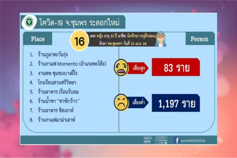 เมื่อวันที่ 12 เม.ย.นพ.จิรชาติ เรืองวัชรินทร์ นายแพทย์สาธารณสุขจังหวัดชุมพร เปิดเผยว่า วันนี้ จ.ชุมพร พบผู้ติดเชื้อรายใหม่เพิ่ม 1 ราย รวม 16 ราย เป็นนักศึกษา ครูฝึกสอน เพศหญิง อายุ 23 ปี รักษาตัวที่ รพ.ชุมพร เขตอุดมศักดิ์ วันนี้ จ.ชุมพร พบผู้ติดเชื้อรายใหม่เพิ่ม 1 ราย รวม 16 ราย เป็นนักศึกษา ครูฝึกสอน เพศหญิง อายุ 23 ปี รักษาตัวที่ รพ.ชุมพร เขตอุดมศักดิ์ โดยไทม์ไลน์ผู้ป่วย มีดังนี้ วันที่ 2 เม.ย. เวลา 20.00 น. เดินทางด้วยรถไฟจาก อ.หลังสวน ไป อ.หัวหิน วันที่ 3 เม.ย. อยู่ อ.หัวหิน วันที่ 4 เม.ย. ช่วงเช้าไปร่วมงานบวชที่วัดไสกระดาน จ.เพชรบุรี – เวลา 15.00 น. ไปที่ร้านซูก้า คาเฟ่ – เวลา 20.00 น. ไปที่ ผับ Line up หัวหินกับเพื่อน วันที่ 5 เม.ย. เวลา 11.00 น. เดินทางรถยนต์ส่วนตัวกลับถึงหลังสวน จ.ชุมพร ในเวลา 17.00 น. – เวลา 19.00 น. ไปร้านภูผาตะวันรุ่ง อ.หลังสวน กับเพื่อนอีก 5 คน – เวลา 22.00 น. กลับบ้าน วันที่ 6 เม.ย. เวลา 14.00 น. ไปร้านกาแฟ โมเมนโต้ อ.พะโต๊ะ กับเพื่อน 5 คน – เวลา 18.00 น. ไปศาลกรมหลวงปากน้ำหลังสวน กับเพื่อนอีก 4 คน – เวลา 19.30 น. ไปงานศพที่บ้านบางยี่โร (ใกล้วัดบางยี่โร)โดยมีเพื่อนนั่งโต๊ะเดียวกัน 5 คน วันที่ 7 เม.ย. เวลา 09.00 น. เดินทางไป จ.สุราษฎร์ธานี กับเพื่อนอีก 2 คน – เวลา 11.00 น. แวะที่ร้านอะไหล่ อ.พุนพิน – เวลา 12.00 น. เข้าม.ราษภัฏสุราษฎร์ – เวลา 13.15 น. – 16.00 น. เข้าสอบที่อาคารวิทยาศาสตร์ ม.ราษภัฏสุราษฎร์ – เวลา 16.30 น. เริ่มมีอาการเจ็บคอ มีน้ำมูก หนาว – เวลา 16.45 น. ไปหาเพื่อนที่หอพักร่วมกับเพื่อน 5 คนที่ อ.เมือง สุราษฎร์ธานี – เวลา 18.30 น. ไปทานอาหารที่เซ็นทรัล สุราษฎร์ธานี – เวลา 19.30 น. เดินทางกลับ อ.หลังสวน จ.ชุมพร ถึงเวลา 21.00 น. พักที่บ้าน วันที่ 8 เม.ย. เวลา 07.30 น. – 12.00 น. ไปปฎิบัติงานที่ รร.สวนศรีวิทยา – เวลา 14.00 น. เดินทางกลับบ้านที่หลังสวน – เวลา 16.30 น. ทานอาหารกับเพื่อนที่ร้านอาหาร เรือนรับลม – เวลา 18.00 น. เดินทางกลับบ้าน – เวลา 19.30 น. ทานอาหารกับเพื่อน ร้านน้ำชา – เวลา 21.30 น. ไปที่ ร้านชิลเอาท์ กับเพื่อน – เวลา 22.30 น. กลับบ้าน วันที่ 9 เม.ย. เวลา 06.00 น. – 11.00 น. อยู่บ้าน มีอาการเล็กน้อย – เวลา 11.00 น. ไป ห้างโลตัส หลังสวน – เวลา 12.00 น. ไป ร้านกาแฟมาม่าเฮ้าท์ อ.หลังสวน – เวลา 13.00 น. ไป รร.สวนศรีวิทยา อ.หลังสวน – เวลา 16.00 น. กลับบ้าน   วันที่ 10 เม.ย. ช่วงเช้าพักอยู่บ้าน – เวลา 15.30 น. – 16.30 น. แม่และยายมาเยี่ยมที่บ้าน – วันที่ 11 เม.ย. เวลา 07.00 น. เดินทางมารับการตรวจที่ รพ.วิรัชศิลป์ – เวลา 11.00 น. เดินทางมา รพ.ชุมพรเขตอุดมศักดิ์ เพื่อเก็บสิ่งส่งตรวจหาเชื้อ วันที่ 12 เม.ย. พบเชื้อ โควิด-19