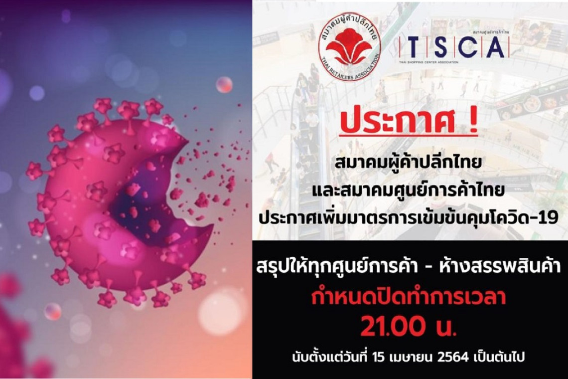 วันที่ 14 เมษายน 2564 นายญนน์ โภคทรัพย์ ประธานสมาคมผู้ค้าปลีกไทย แจ้งว่า สมาคมผู้ค้าปลีกไทย และสมาคมศูนย์การค้าไทย ประกาศยกระดับมาตรการการเฝ้าระวังการระบาดของโควิดครั้งนี้ โดยสมาชิกสมาคมทั้งสองแห่ง และภาคีเครือข่ายทั่วประเทศจะเพิ่มมาตรการเข้มข้นในการคัดกรองผู้บริโภคเข้าศูนย์การค้าและห้างสรรพสินค้า ในระดับสูงสุด และประกาศเลื่อนปิดศูนย์การค้าและห้างสรรพสินค้าทั่วประเทศเป็นเวลา 21.00 น. ทุกวัน