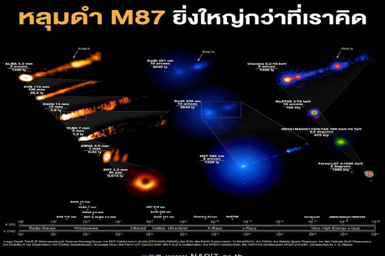 ภาพ: The EHT Multi-wavelength Science Working Group; the EHT Collaboration; ALMA (ESO/NAOJ/NRAO); the EVN; the EAVN Collaboration; VLBA (NRAO); the GMVA; the Hubble Space Telescope; the Neil Gehrels Swift Observatory; the Chandra X-ray Observatory; the Nuclear Spectroscopic Telescope Array; the Fermi-LAT Collaboration; the H.E.S.S collaboration; the MAGIC collaboration; the VERITAS collaboration; NASA and ESA. Composition by J. C. Algaba