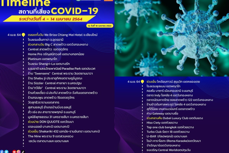 20 เมษายน 2564 08:52 น. สยามรัฐออนไลน์ กทม. กรุงเทพมหานคร อัพเดตไทม์ไลน์สถานที่เสี่ยงโควิด-19 ระหว่างวันที่ 4-14 เม.ย.64 (ข้อมูล ณ วันที่ 18 เม.ย.64) จำนวน 185 สถานที่ มีทั้งห้างสรรพสินค้า ร้านอาหาร โรงแรม ธนาคาร สถานบันเทิง วัด โรงหนัง ลานโบว์ สถานีตำรวจ ค่ายมวย สนามแบดมินตัน สนามบอล ฟิตเนส รถมินิบัส รถตู้ ศาล สถานกงศุล รถมินิบัส รถตู้