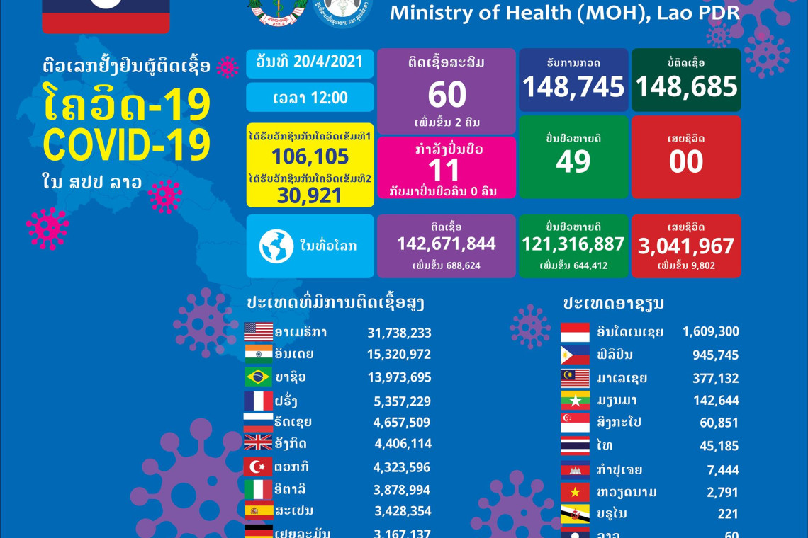 วันที่ 20 เม.ย. 2564 เพจสำนักข่าวสารประเทศลาว รายงานสถานการณ์การแพร่ระบาดของเชื้อโควิด-19 ใน สปป.ลาว ว่า พบผู้ติดเชื้อโควิด-19 รายใหม่ 2 คน โดยรายแรกเป็นผู้หญิงอายุ 25 ปี เป็นนักศึกษาอยู่นครหลวงเวียงจันทน์ และอีกรายเป็นผู้หญิง อายุ 28 ปี อยู่นครหลวงเวียงจันทน์ โดยทั้ง 2 คนมีประวัติสัมผัสใกล้ชิดกับผู้ลักลอบเข้า สปป.ลาวอย่างผิดกฎหมาย