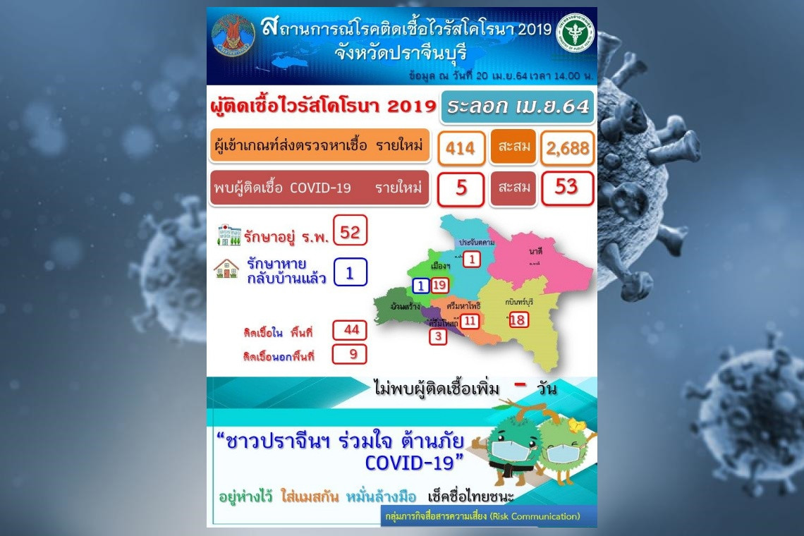 วันที่ 20 เม.ย.64 ผู้สื่อข่าวรายงานว่า นพ.โชคชัย สาครพานิช นายแพทย์สาธารณสุขจังหวัดปราจีนบุรี กรรมการและเลขานุการคณะกรรมการโรคติดต่อจังหวัดปราจีนบุรี ได้ประกาศ จ.ปราจีนบุรีแจ้งว่าจังหวัดปราจีนบุรี ขอแจ้งสถานการณ์การแพร่ระบาดของโรคติดเชื้อไวรัสโคโรนา 2019 ณ วันที่ 20 เมษายน พบผู้ติดเชื้อไวรัสโคโรนา 2019 รายใหม่ จำนวน 5 ราย เป็นผู้ป่วย ในพื้นที่ 44 ราย นอกพื้นที่เข้ามารักษา 9 ราย ทำให้จังหวัดปราจีนบุรี มีผู้ป่วยสะสม (ระลอก เมษายน 2564) ตั้งแต่วันที่ 1-20 เมษายน 2564 จำนวน 53 ราย ได้เข้ารับการรักษา ในโรงพยาบาลทุกราย ผู้สัมผัสใกล้ชิดเสี่ยงสูงได้ติดตามตรวจหาเชื้อแล้ว
