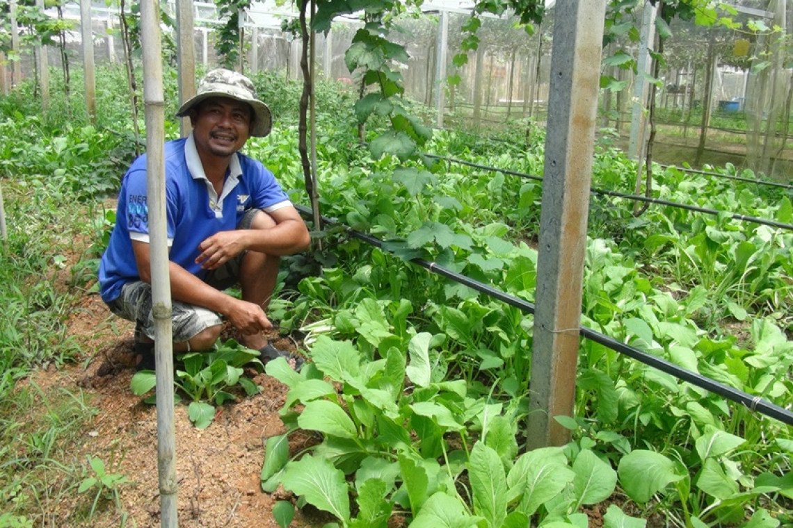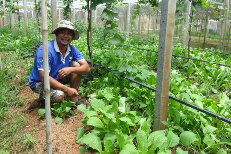 โดยเราปลูกผักปลอดสารพิษ 100 เปอร์เซ็นต์ไม่โรยสารเคมีเลย ใช้ปุ๋ยธรรมชาติ มูลวัวมูลสัตว์ เพราะปลูกผักใต้สวนองุ่นกันแมลงได้ดี เพราะเรามีมุ้ง มีหลังคาโรงเรือนที่เราปลูกองุ่น อีกอย่างเราใช้วิธีปลูกแบบหว่าน เราขายผักสด คนชอบผักสดไม่อยากไปตลาดมาซื้อกินได้เราขายอยู่ที่กิโลกรัมละ 10 บาท ทั้งผักคะน้า ผักกว้างตุ้ง ผักกาดขาว และเตรียมลงแปลงปลูกผักบุ้ง อีกด้วย