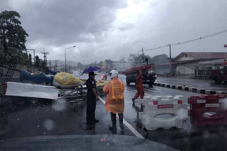 วันที่ 1 พ.ค. 64 ผู้สื่อข่าวรายงานว่า เกิดพายุฤดูร้อน ฝนตกหนัก มีลมกรรโชกแรงทำให้ซุ้มเฉลิมพระเกียรติขนาดใหญ่บริเวณหน้าหอแก้วมุกดาหาร ถล่มลงมาพังเสียหาย และขณะที่พนักงานส่งอาหารขับรถจักรยานยนต์ผ่านมาพอดี ป้ายขนาดใหญ่ล้มลงได้รับบาดเจ็บที่มือ และขาเล็กน้อย อีกทั้งถนนหลายสายในเขตเทศบาลเมืองมุกดาหาร เกิดน้ำท่วมสูงประมาณ 50 เซนติเมตร ทำให้รถเล็กไม่สามารถผ่านได้