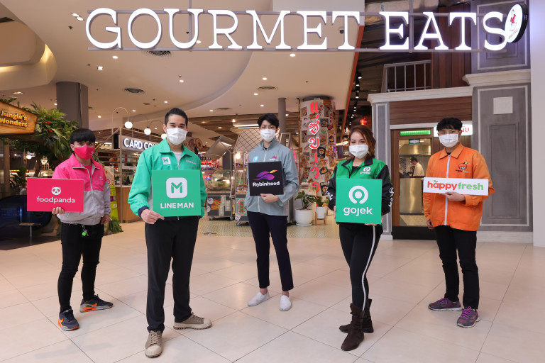 Food Delivery: บริการสั่งอาหารพร้อมทาน จาก กูร์เมต์ อีทส์, ฟู้ดฮอลล์ และ กูร์เมต์ มาร์เก็ต ผ่านแอปพลิเคชัน ได้แก่ Line Man, Gojek, Robinhood, Happy Fresh และ PandaMart ซึ่งมีเมนูอาหารจากร้านดังกว่า 100 ร้าน 400 เมนู ภายใน กูร์เมต์ อีทส์ และฟู้ดฮอลล์ อาทิ ทิพย์สมัย ผัดไทประตูผี, โกอ่างข้าวมันไก่ประตูน้ำ, นายอ้วนเย็นตาโฟเสาชิงช้า, ข้าวขาหมูเซ็นต์หลุยส์, รสเด็ด by รสดีเด็ด, หมูกรอบนายไซ, ครัวพรละมัย, แดงแหนมเนือง, ขนมเบื้องคุณดาว, ราชาขนมโตเกียวเพชร เจ้าเก่า, ขนมปังเจ้าอร่อยเด็ดเยาวราช, ราชาซาลาเปา ฯลฯ พร้อมด้วยเมนู Signature Menu จาก กูร์เมต์ มาร์เก็ต ทั้ง เมนูซุปเพื่อสุขภาพ 0% Trans fat, เมนูสลัดผัก พร้อมด้วยน้ำสลัดหลากหลายสไตล์