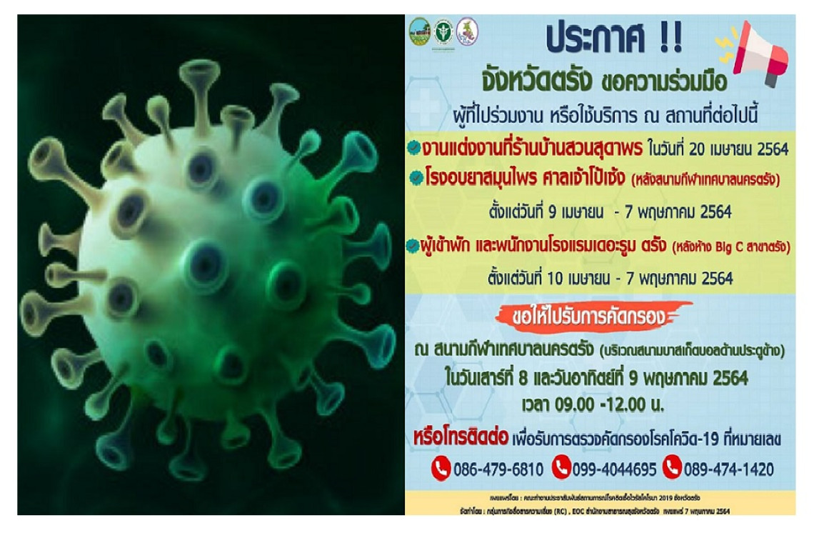 วันที่ 8 พ.ค.2564 นายแพทย์ ตุลกานต์ มักคุ้น นายแพทย์ชำนาญการพิเศษโรงพยาบาลตรังในฐานะโฆษกศูนย์บริหารสถานการณ์การแพร่ระบาดของโรคติดเชื้อไวรัสโคโรนา 2019 จังหวัดตรัง เปิดเผยว่า วันพรุ่งนี้ ( 9 พ.ค.2564 ) จะเป็นอีกหนึ่งวันที่ จังหวัดตรัง จะทำการค้นหาผู้ติดเชื้อและผู้ป่วยโควิด-19 เชิงรุก (Active case finding) พร้อมขอให้ผู้ที่ไปร่วมงานหรือใช้บริการสถานที่เสี่ยง ดังต่อไปนี้ รีบไปรับการตรวจคัดกรอง 1. ผู้ที่ไปร่วมงานหรือใช้บริการนอกสถานที่ต่อไปนี้ คือ งานแต่งงานที่ร้านบ้านสวนสุดาพร ในวันที่ 20 เมษายน 2564 2. โรงอบยาสมุนไพร ศาลเจ้าโป๊เซ้ง (หลังสนามกีฬาเทศบาลนครตรัง ) ตั้งแต่วันที่ 9 เมษายน ถึง 7 พฤษภาคม 2564 3. ผู้เข้าพักรวมถึงพนักงานโรงแรมเดอะรูม จังหวัดตรัง (หลังห้างบิ๊กซี สาขาตรัง) ตั้งแต่วันที่ 10 เมษายนถึง 7 พฤษภาคม 2564 ทั้งนี้ขอให้ไปรับการคัดกรอง ณ สนามกีฬาเทศบาลนครตรัง บริเวณสนามบาสเกตบอลด้านประตูข้าง ในวันอาทิตย์ที่ 9 พฤษภาคม 2564 เวลา 09.00 – 12.00 น. หรือโทรติดต่อเพื่อรับการตรวจคัดกรองโรคโควิด19 ได้ที่ หมายเลขโทรศัพท์ 086-4796810 , 099-4044695 และ 089-4741420