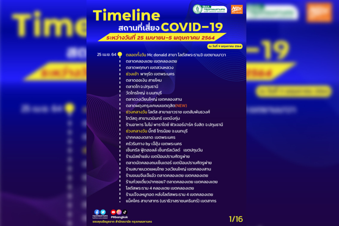 วันที่ 9 พ.ค.64 เพจเฟซบุ๊ก กรุงเทพมหานคร โดยสำนักงานประชาสัมพันธ์ โพสต์ข้อความระบุว่า...วันนี้ มีอัพเดต Timeline เพิ่มเติม อัพเดท Timeline สถานที่เสี่ยง COVID-19 ระหว่าง 25 เมษายน-5 พฤษภาคม 2564 (ข้อมูล ณ วันที่ 9 พฤษภาคม 2564 ) มีรายละเอียดตามรูปด้านล่าง