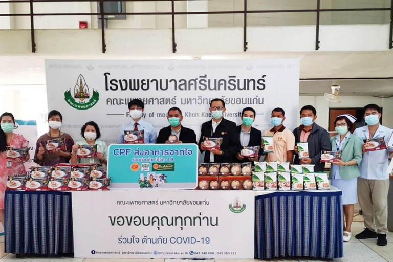 เมื่อวันที่ 10 พ.ค. รศ.นพ.ทรงศักดิ์ เกียรติชูสกุล ผู้อำนวยการ โรงพยาบาลศรีนครินทร์ คณะแพทยศาสตร์ มหาวิทยาลัยขอนแก่น พร้อมด้วย ผศ.ดร.วันชนะ สืบไวย ผู้ช่วยคณบดีฝ่ายศูนย์ความเป็นเลิศและศูนย์กลางบริการสุขภาพ คณะแพทยศาสตร์ ม.ขอนแก่น รับมอบอาหารพร้อมทาน จากบริษัท เจริญโภคภัณฑ์อาหาร จำกัด (มหาชน) หรือซีพีเอฟ ในโครงการ “CPF ส่งอาหารจากใจ ร่วมต้านภัยโควิด-19” ตามนโยบายเครือเจริญโภคภัณฑ์ ภายใต้โครงการ "ซีพีร้อยเรียงใจ สู้ภัยโควิด-19" ที่บริษัทเดินหน้าส่งมอบให้กับโรงพยาบาลและหน่วยงานต่างๆอย่างต่อเนื่อง เพื่อร่วมเป็นส่วนหนึ่งในการลดภาระการจัดเตรียมอาหารให้กับทีมแพทย์ พยาบาล บุคลากรทางการแพทย์ และเจ้าหน้าที่ เป็นการส่งมอบกำลังใจแก่บุคลากรที่ปฏิบัติหน้าที่ดูแลคนไทยทุกคนที่อย่างเต็มกำลัง โดยมี นายยุทธชัย คงสมมาตร ผู้แทนซีพีเอฟ พร้อมชาวซีพีเอฟจิตอาสาจากธุรกิจสุกร จ.ขอนแก่น ร่วมส่งมอบ รศ.นพ.ทรงศักดิ์ เกียรติชูสกุล ผู้อำนวยการ รพ.ศรีนครินทร์ กล่าวขอบคุณซีพีและซีพีเอฟ ที่ร่วมเป็นแรงหนุนสำคัญในภารกิจสู้ภัยโควิด-19 ให้กับทีมแพทย์ในหลายโรงพยาบาลไม่เพียงที่ รพ.ศรีนครินทร์เท่านั้น โดยเฉพาะการนำอาหารปลอดภัยพร้อมรับประทานมาเติมเสบียงให้กับทีมแพทย์ พยาบาล ถือเป็นกำลังใจที่ดีมาก และยังลดเวลาในการจัดหาอาหารในช่วงที่ต้องดูแลพี่น้องประชาชนในวิกฤติเช่นนี้ ทำให้สามารถทุ่มเทเวลาในการดูแลรักษาผู้ป่วยได้อย่างเต็มที่ พร้อมย้ำให้คนไทยตั้งการ์ดสูง เน้นมาตรการป้องกันและแนวปฏิบัติเพื่อการดูแลสุขภาพตนเอง ทั้งการสวมใส่หน้ากากอนามัยตลอดเวลา หมั่นล้างมือ เว้นระยะห่าง รวมถึงอยู่บ้านหยุดเชื้อเพื่อชาติ ซึ่งจะช่วยลดความเสี่ยงการติดเชื้อ เป็นการสนับสนุนการทำงานของแพทย์ได้เช่นกัน ปัจจุบัน ซีพีเอฟได้ดำเนินการส่งมอบอาหารปลอดภัยแล้วกว่า 65,000 แพ็ค, น้ำดื่ม 20,000 ขวด, เครื่องดื่มเพื่อสุขภาพ iMU 3,500 ขวด ตลอดจนวัตถุดิบสำหรับนำไปปรุงอาหาร แก่ โรงพยาบาลและหน่วยงานต่างๆ 42 แห่งทั่วประเทศ
