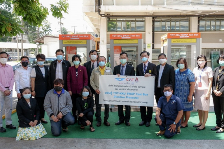 รศ.นพ.สุพัชญ์ สีนะวัฒน์ ผู้อำนวยการสำนักหอสมุด มหาวิทยาลัยขอนแก่น กล่าวรายงานว่า จากสถานการณ์การแพร่ระบาดของไวรัสโควิด 19 ในปัจจุบันส่งผลให้ทุกภาคส่วนทั้งภาครัฐและเอกชน หน่วยงานทางการแพทย์และสาธารณสุขไม่เว้นแม้แต่ห้องสมุดซึ่งเป็นแหล่งเรียนรู้ ต้องหันมาตระหนักถึงความสำคัญของการเฝ้าระวังและป้องกันการแพร่ระบาดของไวรัสโควิด 19 โดยการเผยแพร่และประชาสัมพันธ์การให้ข้อมูลข่าวสารต่างๆ ที่จำเป็นต่อการปฏิบัติตนในการป้องการแพร่ระบาด และการจัดหาเครื่องมือ วัสดุและอุปกรณ์สำหรับป้องการแพร่ระบาดแต่ด้วยสถานการณ์ปัจจุบัน การจัดซื้อเครื่องมือวัสดุและอุปกรณ์ที่ตรงกับความต้องการเป็นไปได้ยาก จึงจำเป็นต้องประดิษฐ์ พัฒนา ดัดแปลงและสร้างสรรค์ต่อยอดนวัตกรรมรูปแบบใหม่ด้วยตนเอง ดังนั้น ด้วยความร่วมมือระหว่าง ฝ่ายนวัตกรรมและวิสาหกิจ KKU Maker Space สำนักหอสมุด มหาวิทยาลัยขอนแก่น และ บริษัทโทรคมนาคมแห่งชาติ จำกัด (มหาชน) จึงได้ดำเนินการผลิตและพัฒนาตู้ TOT-KKU SWAP Test Box แบบความดันบวก (Positive Pressure)โดยดัดแปลงจากตู้โทรศัพท์เก่าที่ได้รับบริจาคจากบริษัทโทรคมนาคมแห่งชาติจำกัด (มหาชน) เพื่อให้บุคลากรทางการแพทย์ใช้สำหรับตรวจคัดกรองผู้ป่วยCOVID-19 ซึ่งเป็นไปตามมาตรการการเฝ้าระวังและลดความเสี่ยงการแพร่กระจายของไวรัสโควิด 19 ตามมาตรฐานของกรมควบคุมโรคที่ได้กำหนดไว้