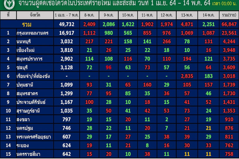 เมื่อวันที่ 14 พ.ค.64 ศูนย์ข้อมูลโควิด-19 รายงานข้อมูลกรมควบคุมโรค กระทรวงสาธารณสุข ถึงจำนวนผู้ติดเชื้อในประเทศรายใหม่และสะสมวันที่ 1 เม.ย.-14 พ.ค.64 เวลา 01.00 น. โดยวันที่ 14 พ.ค.64 พบผู้ติดเชื้อรายใหม่ใน 61 จังหวัด โดยมี 16 จังหวัด ที่ไม่พบผู้ติดเชื้อรายใหม่ ได้แก่ ลำพูน ลพบุรี สุรินทร์ ตราด ตาก น่าน กาฬสินธุ์ พะเยา เลย ชัยนาท หนองคาย แม่ฮ่องสอน หนองบัวลำภู บึงกาฬ อุทัยธานี และสตูล