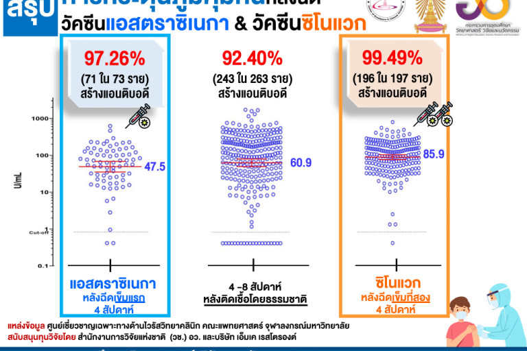เมื่อวันที่ 14 พ.ค. ศาสตราจารย์ ดร.นายแพทย์สิริฤกษ์ ทรงศิวิไล ปลัดกระทรวงการอุดมศึกษา วิทยาศาสตร์ วิจัยและนวัตกรรม (อว.) เปิดเผยผลการศึกษาประสิทธิผลการกระตุ้นภูมิคุ้มกันของวัคซีนโรคโควิด-19 ทั้งสองชนิดที่ฉีดในคนไทย ของศูนย์เชี่ยวชาญเฉพาะทางด้านไวรัสวิทยาคลินิก คณะแพทยศาสตร์ จุฬาลงกรณ์มหาวิทยาลัยว่า ทั้งวัคซีนของซิโนแวก และวัคซีนของแอสตราซิเนกา สามารถกระตุ้นภูมิคุ้มกันได้ดีมาก ผู้ได้รับวัคซีนเกือบทุกราย สามารถสร้างแอนติบอดีในระดับสูง โดย 97.26% ของผู้ที่ฉีดวัคซีนแอสตราซิเนกาเข็มแรกแล้ว 4 สัปดาห์ และ 99.49% ของผู้ที่ฉีดวัคซีนซิโนแวกสองเข็มแล้ว 4 สัปดาห์ สามารถสร้างแอนติบอดีต่อเชื้อไวรัสโควิด-19 ได้