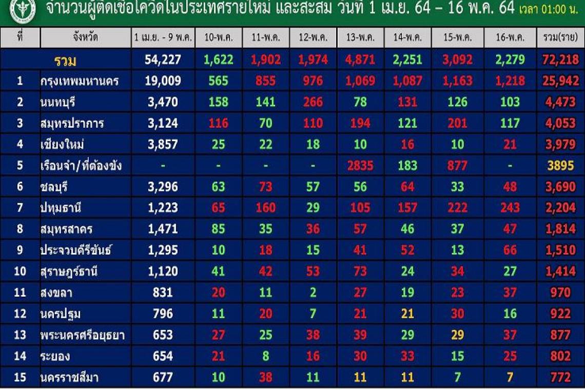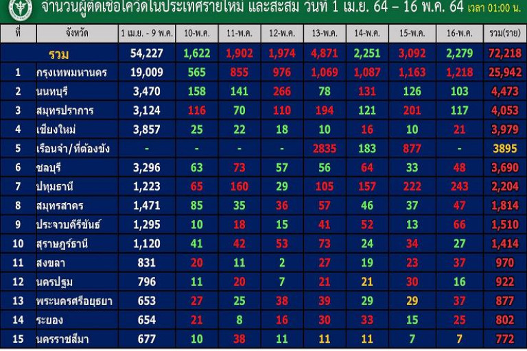 เมื่อวันที่ 16 พ.ค.64 ศูนย์ข้อมูลโควิด-19 รายงานข้อมูลกรมควบคุมโรค กระทรวงสาธารณสุข ถึงจำนวนผู้ติดเชื้อในประเทศรายใหม่และสะสมวันที่ 1 เม.ย.-16 พ.ค.64 เวลา 01.00 น. โดยวันที่ 15 พ.ค.64 พบผู้ติดเชื้อรายใหม่ใน 58 จังหวัด โดยมี 19จังหวัด ที่ไม่พบผู้ติดเชื้อรายใหม่ ได้แก่ ลำพูน อ่างทอง นครพนม ตราด น่าน สุโขทัย สมุทรสงคราม กาฬสินธุ์ ชุมพร อุตรดิตถ์ ชัยนาท หนองคาย อำนาจเจริญ แม่ฮ่องสอน หนองบัวลำภู บึงกาฬ อุทัยธานี และสตูล สำหรับ 10 อันดับจังหวัดที่มีผู้ป่วยติดเชื้อรายใหม่ (รายวัน) สูงสุดได้แก่ ขณะที่ 10 อันดับจังหวัดที่มีผู้ป่วยติดเชื้อยอดรวมสูงสุดได้แก่ อันดับ 1 กทม. รายใหม่ 1,218 ยอดรวม 25,942 ราย อันดับ 2 นนทบุรี รายใหม่ 103 ยอดรวม 4,473 ราย อันดับ 3 สมุทรปราการ รายใหม่ 117 ยอดรวม 4,053 ราย อันดับ 4 เชียงใหม่ รายใหม่ 21 ยอดรวม 3,979 ราย อันดับ 5 ชลบุรี รายใหม่ 48 ยอดรวม 3,690 ราย อันดับ 6 ปทุมธานี รายใหม่ 243 ยอดรวม 2,204 ราย อันดับ 7 สมุทรสาคร รายใหม่ 47 ยอดรวม 1,814 ราย อันดับ 8 ประจวบคีรีขันธ์ รายใหม่ 66 ยอดรวม 1,510 ราย อันดับ 9 สุราษฎร์ธานี รายใหม่ 27 ยอดรวม 1,414 ราย อันดับ 10 สงขลา รายใหม่ 37 ยอดรวม 970 ราย