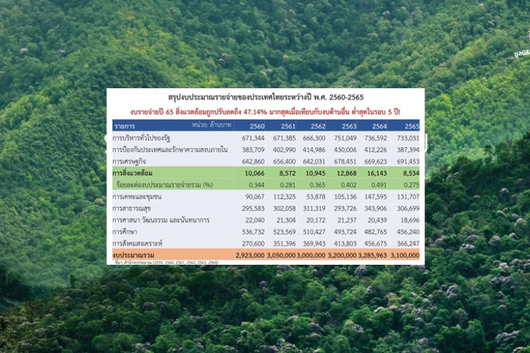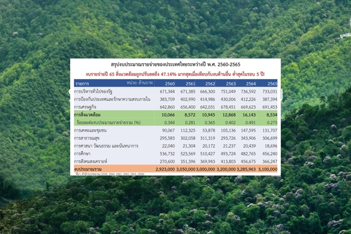 หลายท่านคงได้ทราบข่าวการจัดสรรงบประมาณรายจ่ายของประเทศปี 2565 กันแล้วนะครับ ส่วนใหญ่ถูกตัดงบประมาณกันถ้วนหน้า เข้าใจว่างบประมาณคงมีจำกัดในปี 65 แต่สิ่งที่น่าตกใจคือ งบประมาณรายจ่ายด้านสิ่งแวดล้อม ปี 65 นับว่าวิกฤติมาก ถูกหั่นลดลงจาก 16,143 ล้านบาทในปี 2564 เหลือ 8,534 ล้านบาทในปี 2565 คิดเป็นร้อยละ 0.275 ของงบประมาณรายจ่ายรวม ลดลงถึง 47.14% เมื่อเทียบกับงบด้านอื่น นับว่าต่ำสุดในรอบ 5 ปี!