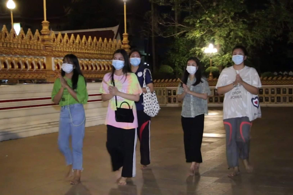 ชาวขอนแก่นสวมหน้ากากอนามัยออกมาเวียนเทียนเนื่องในวันวิสาขบูชาที่วัดช่วงหัวค่ำบางตา แต่มีจำนวนมากขึ้นหลัง 2 ทุ่มเพราะหลายคนเชื่อปรากฏการณ์ราหูอมจันทร์ห้ามออกจากบ้านเวลา 18.00 – 20.00 น.