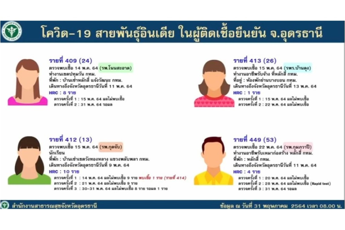 นายแพทย์อุเทน หาแก้ว รองนายแพทย์สาธารณสุข จ.อุดรธานี เปิดเผยว่า ถึงวันนี้ (31 พ.ค.64) ยอดผู้ติดเชื้อสะสม 488 ราย รักษาหาย 418 ราย รักษาตัวอยู่ 66 ราย ยอดเสียชีวิตรวมแล้ว 4 ราย วันนี้มีเรื่องที่จะแจ้งให้พี่น้องประชาชนได้รับทราบว่า ขณะนี้พบผู้ติดเชื้อไวรัสโควิด 19 สายพันธุ์อินเดียวในพื้นที่จ.อุดรธานีแล้วจำนวน 4 ราย เป็นคนงานที่เดินทางมาจากแคมป์คนงานหลักสี่ คือ รายที่ 409 เพศหญิง อายุ 24 ปี ทำงานอยู่เขตปทุมวัน กรุงเทพฯ รักษาตัวอยู่รพ.อ.โนนสะอาด รายที่ 413 เพศหญิง อายุ 26 ปีอาชีพรับจ้างอยู่หลักสี่ รักษาตัว อยู่อ.บ้านดุง รายที่ 412 เพศหญิง อายุ 13 ปีอยู่อ.กุดจับ และรายที่ 449 เป็นเพศชาย อายุ 53 ปี ทำงานรับเหมาก่อสร้างในแคมป์หลักสี่ ผลปรากฏว่าเป็นเชื้อโควิด-19 สายพันธุ์อินเดีย ซึ่ง ทั้ง 4 รายตอนนี้กระจายการรักษาตัวที่ รพ.โนนสะอาด ,รพ.กุดจับ , รพ.บ้านดุง และ รพ.กุมภวาปี ตอนนี้จังหวัดอุดรธานีมีการแพร่ระบาดหลายคลัสเตอร์ เช่น คลัสเตอร์นวดแผนไทย งานเลี้ยงเกษียนของสหกรณ์ออมทรัพย์ที่อ.กุดจับ งานขนส่งสินค้า คลัสเตอร์สำนักงานที่ดิน และมีการระบาดไปในหลายอำเภอทั้งอ.กุดจับ อ.โนนสะอาด อ.บ้านดุง และอ.กุมภวาปี เป็นต้น โดยรวมมีโอกาสพบผู้ติดเชื้ออย่างต่อเนื่อง เพราะยังมีผู้เดินทางมาจากพื้นที่เสี่ยงอยู่ เราต้องเฝ้าระวังอย่างใกล้ชิด โดยเฉพาะสายพันธุ์อินเดียที่พบการะบาดแล้วในจ.อุดรธานี