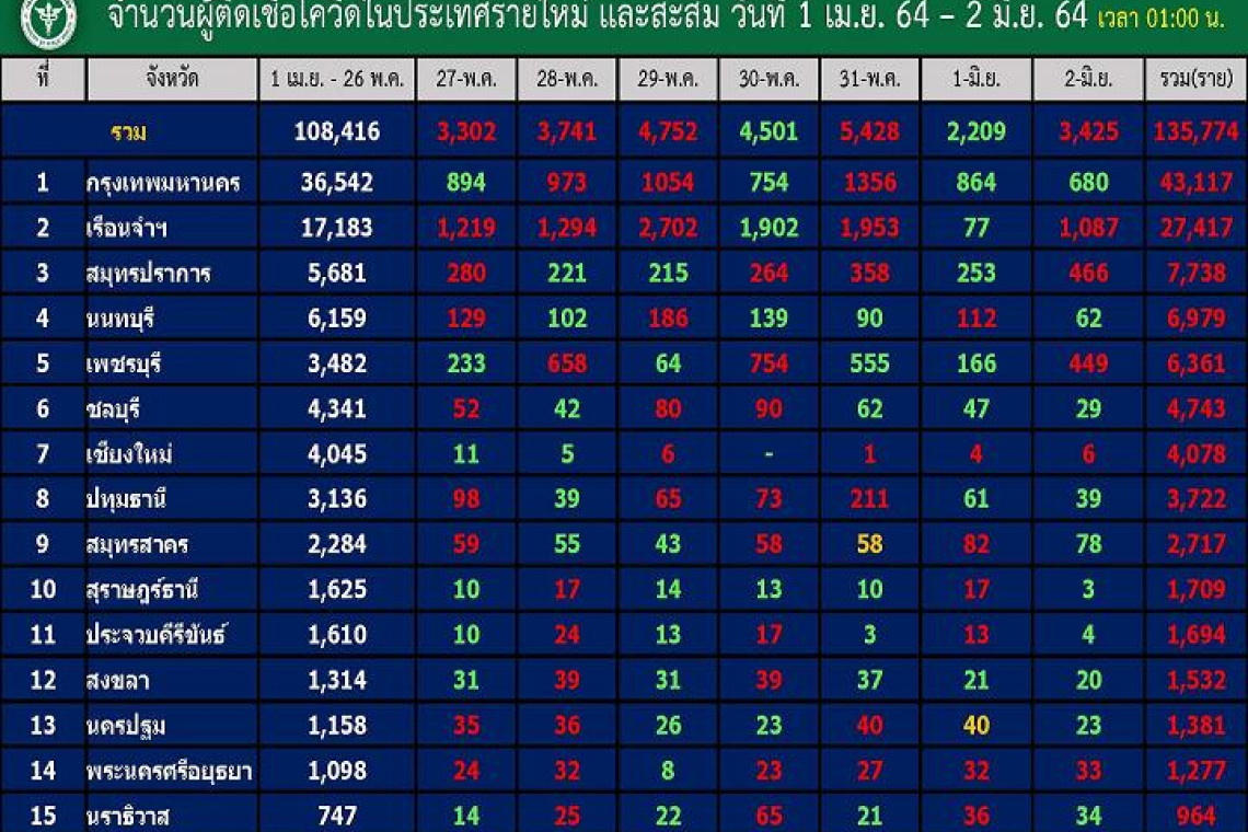 เมื่อวันที่ 2 มิ.ย.64 ศูนย์ข้อมูลโควิด-19 รายงานข้อมูลกรมควบคุมโรค กระทรวงสาธารณสุข ถึงจำนวนผู้ติดเชื้อในประเทศรายใหม่และสะสมวันที่ 1 เม.ย.-2 มิ.ย.64 เวลา 01.00 น. โดยวันที่ 2 มิ.ย.64 พบผู้ติดเชื้อรายใหม่ใน 56 จังหวัด โดยมี 21 จังหวัด ที่ผู้ติดเชื้อรายใหม่เป็น 0 ได้แก่ ขอนแก่น สระแก้ว มหาสารคาม ลำพูน ลำปาง บุรีรัมย์ อ่างทอง พิจิตร ตราด น่าน สิงห์บุรี ชุมพร พะเยา อุตรดิตถ์ หนองคาย พังงา หนองบัวลำภู อำนาจเจริญ แม่ฮ่องสอน มุกดาหาร และสตูล สำหรับ 10 อันดับจังหวัดที่มีผู้ป่วยติดเชื้อรายใหม่ (รายวัน) สูงสุดได้แก่ ขณะ 10 อันดับจังหวัดที่มีผู้ป่วยติดเชื้อสะสมสูงสุดได้แก่ อันดับ 1 กทม. รายใหม่ 680 ยอดรวม 43,117 ราย อันดับ 2 สมุทรปราการ รายใหม่ 266 ยอดรวม 7,738 ราย อันดับ 3 นนทบุรี รายใหม่ 62 ยอดรวม 6,979 ราย อันดับ 4 เพชรบุรี รายใหม่ 449 ยอดรวม 6,361 อันดับ 5 ชลบุรี รายใหม่ 29 ยอดรวม 4,743ราย อันดับ 6 เชียงใหม่ รายใหม่ 6 ยอดรวม 4,078 ราย อันดับ 7 ปทุมธานี รายใหม่ 39 ยอดรวม 3,722 ราย อันดับ 8 สมุทรสาคร รายใหม่ 78 ยอดรวม 2,717 ราย อันดับ 9 สุราษฎร์ธานี รายใหม่ 3 ยอดรวม 1,709 ราย อันดับ 10 ประจวบคีรีขันธ์ รายใหม่ 4 ยอดรวม 1,694 ราย ขณะที่ตรัง วันนี้เป็นอีกวันที่รายงานตัวเลขติดเชื้อ 3 หลัก ที่ 176 ราย