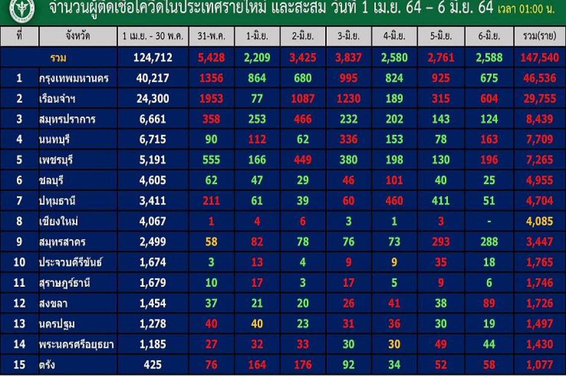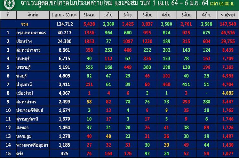 เมื่อวันที่ 6 มิ.ย.64 ศูนย์ข้อมูลโควิด-19 รายงานข้อมูลกรมควบคุมโรค กระทรวงสาธารณสุข ถึงจำนวนผู้ติดเชื้อในประเทศรายใหม่และสะสมวันที่ 1 เม.ย.-6 มิ.ย.64 เวลา 01.00 น. โดยวันที่ 6 มิ.ย.64 พบผู้ติดเชื้อรายใหม่ใน 52 จังหวัด โดยมี 25 จังหวัด ที่ไม่พบผู้ติดเชื้อรายใหม่ ได้แก่ เชียงใหม่ นครราชสีมา เชียงราย สระแก้ว ขอนแก่น อุดรธานี พิษณุโลก ตาก กระบี่ ลำปาง พิจิตร ยโสธร นครพนม สกลนคร ตราด น่าน พะเยา อุตรดิตถ์ แพร่ ชัยนาท พังงา อำนาจเจริญ แม่ฮ่องสอน บึงกาฬ และสตูล สำหรับ 10 อันดับจังหวัดที่มีผู้ป่วยติดเชื้อรายใหม่ (รายวัน) สูงสุดได้แก่ ขณะ 10 อันดับจังหวัดที่มีผู้ป่วยติดเชื้อสะสมสูงสุดได้แก่ อันดับ 1 กทม. รายใหม่ 675 ยอดรวม 46,536 ราย อันดับ 2 สมุทรปราการ รายใหม่ 124 ยอดรวม 8,439 ราย อันดับ 3 นนทบุรี รายใหม่ 163 ยอดรวม 7,709 ราย อันดับ 4 เพชรบุรี รายใหม่ 196 ยอดรวม 7,265 ราย อันดับ 5 ชลบุรี รายใหม่ 25 ยอดรวม 4,955 ราย อันดับ 6 ปทุมธานี รายใหม่ 51 ยอดรวม 4,704 ราย อันดับ 7 เชียงใหม่ รายใหม่ 0 ยอดรวม 4,085 ราย อันดับ 8 สมุทรสาคร รายใหม่ 288 ยอดรวม 3,442 ราย อันดับ 9 ประจวบคีรีขันธ์ รายใหม่ 18 ยอดรวม 1,765 ราย อันดับ 10 สุราษฎร์ธานี รายใหม่ 6 ยอดรวม 1,746 ราย