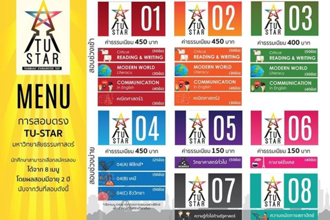 มหาวิทยาลัยธรรมศาสตร์ (มธ.) เปิดรับสมัครสอบ "TU STAR" ครั้งที่ 4/2559 สำหรับผู้สำเร็จการศึกษา หรือผู้กำลังศึกษาชั้น ม.ปลาย เทียบเท่าทั้งในและต่างประเทศ เพื่อใช้สำหรับสมัครเข้าศึกษาในโครงการรับตรง 14 คณะ 48 หลักสูตร อาทิ คณะพาณิชยศาสตร์และการบัญชี คณะรัฐศาสตร์ คณะเศรษฐศาสตร์ คณะสังคมสงเคราะห์ศาสตร์ คณะศิลปศาสตร์ และสถาบันเทคโนโลยีนานาชาติสิรินธร เป็นต้น