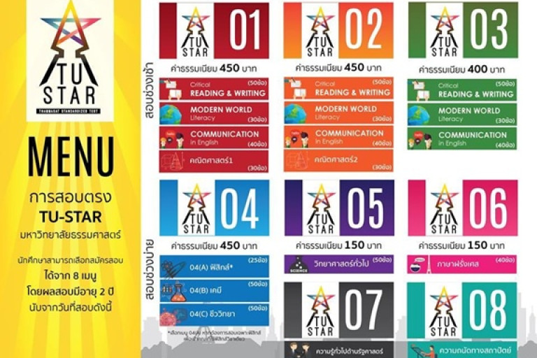 โดยสามารถตรวจสอบคุณสมบัติและสมัครออนไลน์ในครั้งที่ 4 ได้ระหว่างวันที่ 12-18 ก.ย.59 ที่เว็บไซต์ www.tustar.tu.ac.th โดยกำหนดสอบในวันอาทิตย์ที่ 9 ต.ค.59 สอบถามเพิ่มเติมโทร.0-2613-2199, 0-2224-9730 และ 0-2226-4511 (SMART Center) หรือเข้าไปที่เว็บไซต์ www.tustar.tu.ac.th และ www.facebook.com/TUSTAR.Thammasat