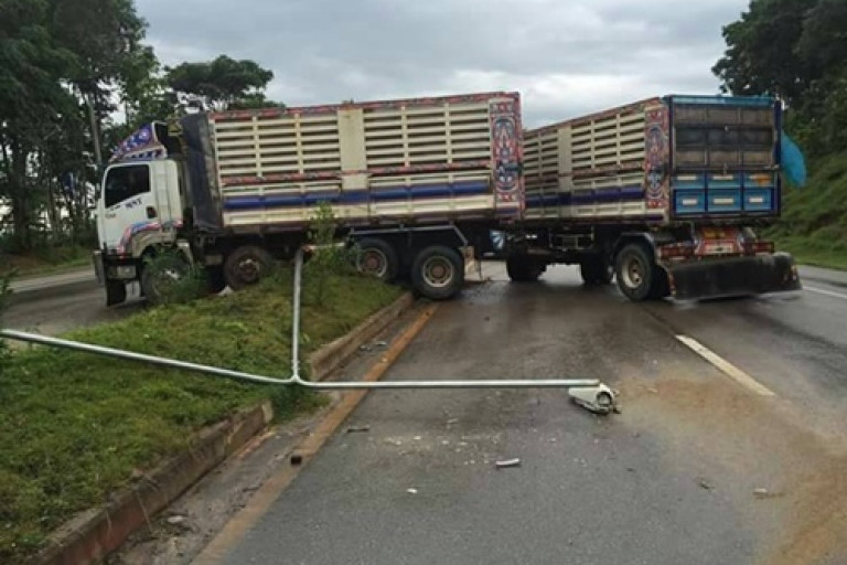 เจ้าหน้าที่ประจำจุดตรวจห้วยหินฝน ได้วิ่งหลบหนีออกจากด่านเพื่อไปหลบยังที่ปลอดภัย ก่อนที่รถพ่วงคันดังกล่าวจะวิ่งผ่านจุดด่าน จากนั้นคนขับพยายามประคองรถลงเขาไปได้อีกประมาณ 2 กม. สุดท้ายก็ไม่สามารถควบคุมรถได้ เมื่อถึงบริเวณ หลัก กม.ที่ 12 รถได้แหกโค้งหน้าอนุสรณ์ผู้เสียสละจังหวัดตาก พุ่งชนเสาไฟฟ้าอย่างแรง จนเสาไฟหัก 1 ต้น รถคาอยู่เกาะกลางถนน ถังน้ำมันขนาด 400 ลิตร แตกน้ำมันรั่วไหลลงผิวจราจรเต็มถนนที่เป็นทางลงเขา โชคดีคนขับปลอดภัย ขณะนี้เจ้าหน้าที่ ทหาร-ตำรวจ-แขวงการทางตากที่ 2 แม่สอด ได้เคลื่อนย้ายรถคันที่เกิดออกจากพื้นที่การจราจรติดขัดอย่างเร่งด่วน และประกาศให้ประชาชนที่จะใช้เส้นทางการจราจรผ่านบริเวณดังกล่าวให้เพิ่มความระมัดระวังในการขับขี่ยานพาหนะ ด้วย