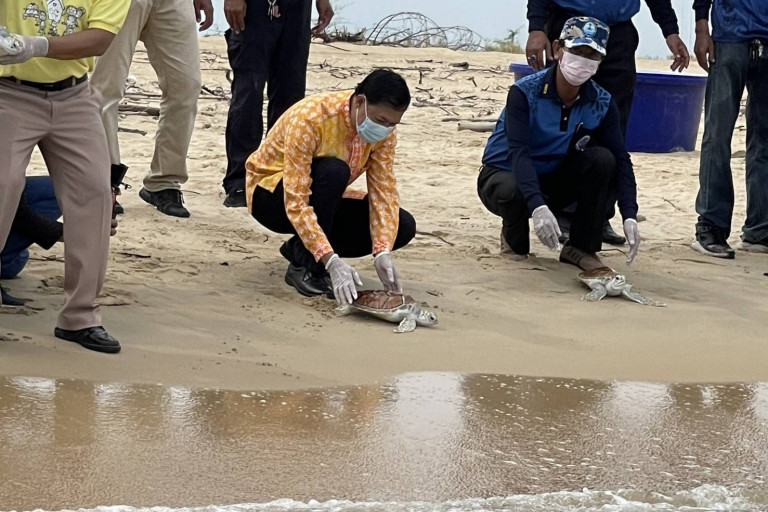 นายสมไชย เก้าเอี้ยน ผู้อำนวยการสำนักงานทรัพยากรทางทะเลและชายฝั่งที่ 9 หน่วยงานที่เกี่ยวข้อง ชาวประมง และชาวบ้าน มาร่วมกันปล่อยสัตว์ทะเล และเก็บขยะครั้งนี้กันอย่างคึกคัก