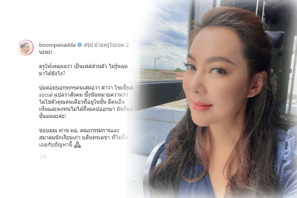 ล่าสุด บุ๋ม ปนัดดา ได้ออกมาโพสต์ความเคลื่อนเกี่ยวกับประเด็นดังกล่าวผ่านอินสตาแกรมboompanadda ว่า...“สรุป ย้ายครูไปเขต 2 นะคะ! ครูให้เหตุผลว่า เป็นเฟสส่วนตัว ไม่รู้หลุดมาได้ยังไง?