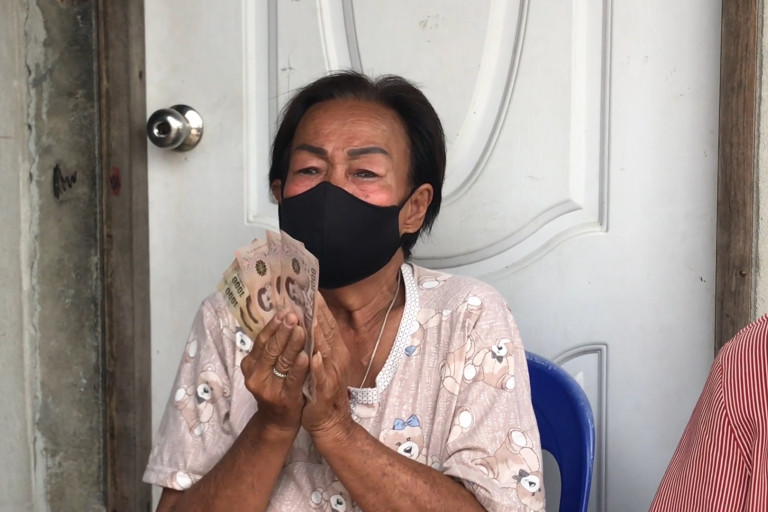 นางธนพร หรือ ป้าต๋อย บอกว่า วันนี้ไม่มีเงินติดตัวแล้ว ลูกชายก็เพิ่งออกจากบ้านไปเพื่อเอาทองแดงจากพัดลม เครื่องใช้ไฟฟ้าที่มีคนเอามาให้ ไปชั่งขายที่ร้านรับซื้อของเก่า ส่วนลูกสะใภ้ก็กลับไปต่างจังหวัดเพื่อไปหยิบยืมเงินญาติๆมาให้ ก็กลับมาไม่ได้เพราะโดนกักตัว 14 วัน เมื่อวานก็ไปหาหมอที่คลีนิดชุมชน ฉีดมาที่ขามา 60 บาทก็ไม่เหลือเงินเลย ช่วงเย็นก็ไปนั่งร้องไห้ที่ศาลาวัดใหม่ปิ่นเกลียว คิดว่าจะปีนแทงค์น้ำ และกระโดดลงมาฆ่าตัวตายให้จบเรื่องไป แต่ก็ยังห่วงหลานๆ วันนี้มีเพื่อนบ้านที่ทราบข่าวก็ให้กำลังใจมาบอกว่าอย่าคิดสั้น และยังไม่มีหน่วยงานราชการใดมาติดต่อ และตนเองก็ไม่รู้จะไปหันพึ่งใครอีกแล้ว