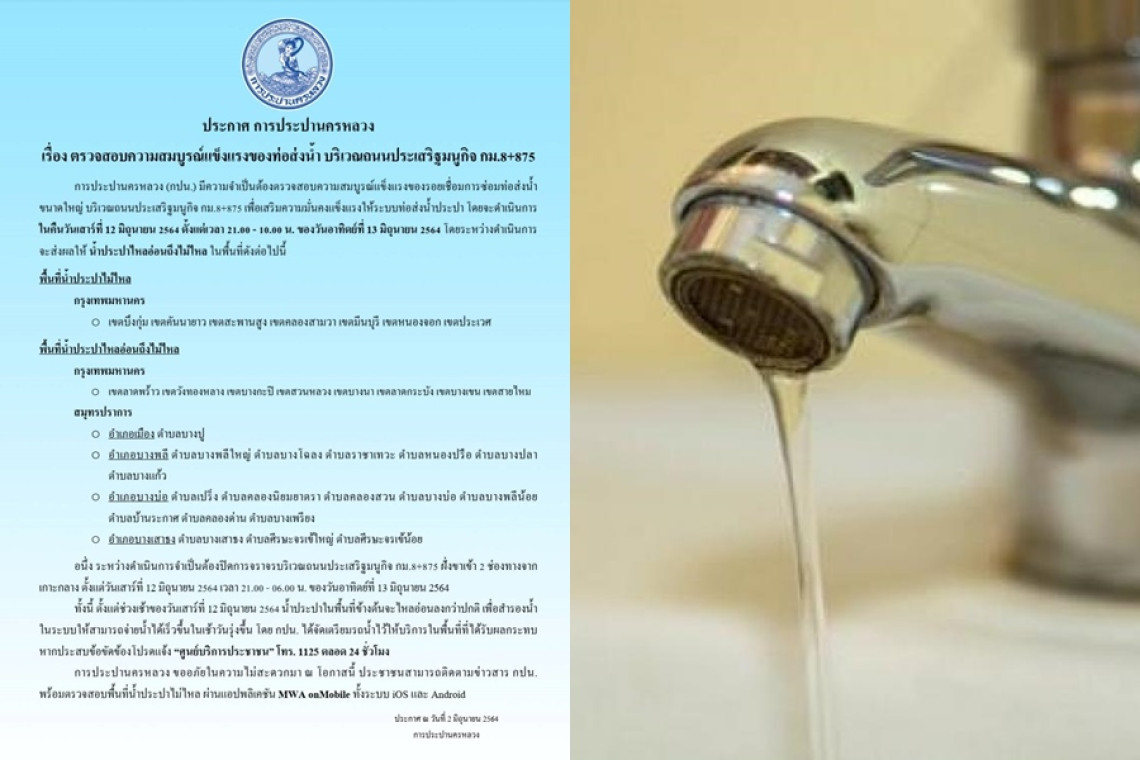 ทั้งนี้ ตั้งแต่ช่วงเช้าของวันเสาร์ที่ 12 มิ.ย.64 น้ำประปาในพื้นที่ข้างต้นจะไหลอ่อนลงกว่าปกติ เพื่อสำรองน้ำในระบบให้สามารถจ่ายน้ำได้เร็วขึ้นในเช้าวันรุ่งขึ้น โดย กปน. ได้จัดเตรียมรถน้ำไว้ให้บริการในพื้นที่ที่ได้รับผลกระทบ หากประสบข้อขัดข้องโปรดแจ้ง “ศูนย์บริการประชาชน” โทร. 1125 ตลอด 24 ชั่วโมง