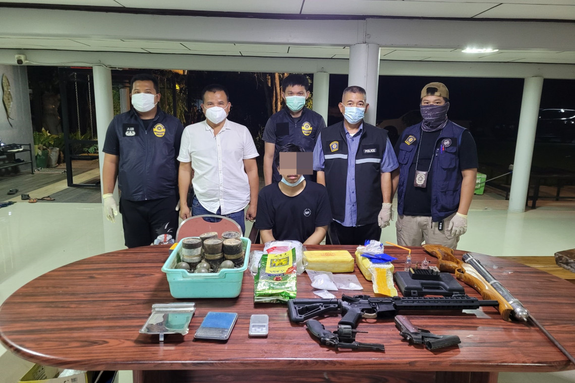 โดยรายแรกจับกุม นายสมชาย หรือต้น นิลสุวรรณ อายุ 26 ปี ขณะอยู่อู่ซ่อมรถจักรยานยนต์ ทีดี มิชนิธ เลขที่ 670/16 ม.5 ต.นาเกลือ อ.บางละมุง จ.ชลบุรี พร้อมกับตรวจค้นภายในตึกแถวเลขที่ 670/5-10 ถ.พัทยานาเกลือ ม.5 ต.นาเกลือ จนพบของกลาง ยาไอซ์น้ำหนักรวม 132.1 กรัม , ยาบ้า 19,800 เม็ด , ลูกระเบิดขว้างแบบเอ็ม67 จำนวน 5 ลูก , อาวุธปืนยาว ขนาด .22 ยี่ห้อทีเอส สีดำ ทะเบียน กท5956182 จำนวน 1 กระบอก , อาวุธปืนพกสั้นแบบลูกโม่ ขนาด .38 ยี่ห้อสมิทแอนด์เวสสัน ไม่มีหมายเลขทะเบียน 1 กระบอก , อาวุธปืนพกสั้น แบบไทยประดิษฐ์ 1 กระบอก , ปืนยาวอัดลม 1 กระบอก , กระสุนปืนขนาดต่างๆ รวม 19 นัด, โทรศัพท์มือถือ 1 เครื่อง และอุปกรณ์การเสพ 1 ชุด โดยกล่าวหาว่า “มียาเสพติดให้โทษ ประเภท 1 (ยาบ้า,ไอซ์) ไว้ในความครอบครองเพื่อจำหน่าย,มีอาวุธปืน วัตถุระเบิด(ที่นายทะเบียนออกใบอนุญาตให้ไม่ได้) และเครื่องกระสุนปืนไว้ในความครอบครองโดยไม่ได้รับอนุญาต และ เสพยาเสพติดให้โทษ ประเภท 1 (เมทแอมเฟตามีน) โดยผิดกฎหมาย” นอกจากนี้ยังยึดทรัพย์สิน ทั้งสังหาฯ และอสังหาริมทรัพย์ ตาม พ.ร.บ.มาตรการในการปราบปรามผู้กระทำความผิดเกี่ยวกับยาเสพติด พ.ศ.2534 รวมมูลค่ากว่า 3,115,000 บาท