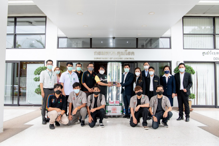 ศาสตราจารย์ ดร.สุชาติ เซี่ยงฉิน อธิการบดี มหาวิทยาลัยเทคโนโลยีพระจอมเกล้าพระนครเหนือ (มจพ.) พร้อมด้วย ภรณี ลีนุตพงษ์ กรรมการสภามหาวิทยาลัยผู้ทรงคุณวุฒิ ผู้ช่วยศาสตราจารย์ สมชาย เวชกรรม รองอธิการบดีฝ่ายกิจการนักศึกษาและศิษย์เก่าสัมพันธ์ อาจารย์ ดร.สราวุฒิ สืบแย้ม ผู้ช่วยอธิการบดีฝ่ายการคลังและกิจการทั่วไป ผู้ช่วยศาสตราจารย์ ดร.ณัฐพงศ์ มกระธัช ผู้ช่วยอธิการบดีฝ่ายพัฒนาสิ่งแวดล้อมและกายภาพ ทีมผู้วิจัย รองศาสตราจารย์ ดร.ศุภชัย ตระกูลทรัพย์ทวี ผู้ช่วยศาสตราจารย์ ดร.สถาพร วังฉาย และคุณอุดม สุขสุดประเสริฐ ตัวแทนศิษย์เก่า นักศึกษาคณะวิศวกรรมศาสตร์ ร่วมมอบหุ่นยนต์ประดู่แดงฉายแสง UVC ให้แก่โรงพยาบาลรามาธิบดี และกรมควบคุมโรค กระทรวงสาธารณสุข โดยมี ศ.นพ.ปิยะมิตร ศรีธรา คณบดีคณะแพทยศาสตร์โรงพยาบาลรามาธิบดี มหาวิทยาลัยมหิดล ผศ.นพ.ภาวิทย์ เพียรวิจิตร รองคณบดีฝ่ายสื่อสารองค์กร และ ผศ.นพ.เฉลิมพงษ์ ฉัตรดอกไม้ไพร หัวหน้าภาควิชาศัลยศาสตร์ คณะแพทยศาสตร์โรงพยาบาลรามาธิบดี มหาวิทยาลัยมหิดล เป็นผู้รับมอบ