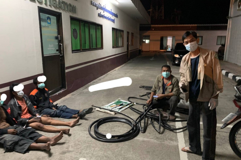 วันที่ 13 มิ.ย.64 ที่ สภ.ชะอำ จ.เพชรบุรี พล.ต.ต.อุทัย กวินเดชาธร ผู้บังคับการตำรวจภูธรจังหวัดเพชรบุรี , พ.ต.อ.โกศล ยามา ,พ.ต.อ. กานต์ ธรรมเกษม รอง ผบก.ภ.จว.เพชรบุรี ,พ.ต.อ. ปัญญา กุลไทย ผกก.สภ.ชะอำ , พ.ต.ท. อภิเชษฐ์ ทรัพย์ส่งเสริม รอง ผกก.สส.สภ.ชะอำ , พร้อมชุด สืบสวน สภ.ชะอำ แถลงข่าวจับกุมนายอนุ หรือนุ เกตุสุริยวงศ์ อายุ 31 ปีอยู่บ้านเลขที่ 31 ถนนบ้านพลี2 ต. ชะอำ อ.ชะอำ จ.เพชรบุรี,นายจรูญ หรือเบิร์ด แก้วใหญ่ อายุ 32 ปีอยู่บ้านเลขที่ 8/21 หมู่ที่2 ต.ปากน้ำปราณ อ.ปราณบุรี จ.ประจวบคีรีขันธ์และนายอภิศักดิ์ หรือกอก ศรีหอม อายุ 38 ปีอยู่บ้านเลขที่ 140/20 หมู่ที่3 ต.ปากน้ำปราณ อ.ปราณบุรี จ.ประจวบคีรีขันธ์ พร้อมของกลาง สายสัญญาณโทรศัพท์ ขนาด 200-.5 AP ความยาวประมาณ 40 เมตร,มีดพร้าต่อด้ามยาว ความยาวใบมีดพร้อมด้าม ยาวประมาณ 75 เซนติเมตร จำนวน 1 เล่ม,เลื่อยมือ ความยาวใบมีดพร้อมด้าม ยาวประมาณ 55 ซม. จำนวน 1 เล่ม ,คีมตัดลวด สีเหลือง จำนวน 1 อัน,รถจักรยานยนต์ ยี่ห้อ ฮอนด้า รุ่นเวฟ 125ไอ สีแดง หมายเลขทะเบียน ป้ายแดง จำนวน 1 คัน,รถจักรยานยนต์ ยี่ห้อฮอนด้า รุ่นเวฟ 110ไอ สีขาว-น้ำเงิน หมายเลขทะเบียน 1 กต 1679 เพชรบุรี จำนวน 1 คัน พฤติการณ์ กล่าวค่ลือคือ ช่วงตั้งแต่เดือนมีนาคม 2564 เรื่อยมา ได้เกิดเหตุคนร้ายได้ ร่วมกันก่อเหตุตระเวนลักตัดสายสัญญาณโทรศัพท์ ของ บริษัท โทรคมนาคมแห่งชาติ จำกัด (มหาชน) –TOT ในเขตพื้นที่อำเภอชะอำ จังหวัดเพชรบุรี ซึ่งอยู่ในเขตความรับผิดชอบชอง สภ.ชะอำ จำนวนหลายครั้ง โดยในแต่ละครั้งจะได้สายสัญญาณ (สายเคเบิ้ล) ซึ่งด้านในผลิตจากทองแดง ไปเป็นจำนวน 10 - 250 เมตร ทำให้บริษัทโทรคมนาคมแห่งชาติฯ ได้รับความเสียหาย มูลค่ารวมสี่แสนบาทเศษและเกิดความไม่สะดวกกับประชาชนผู้ใช้บริการโทรศัพท์เพราะสัญญาณขัดข้อง ต่อมาฝ่ายสืบสวน สภ.ชะอำ จึงได้ลงพื้นที่ทำการสืบสวนและอาศัยความร่วมมือของเจ้าหน้าที่ของบริษัท โทรคมนาคมแห่งชาติฯ จนทราบว่าคนร้ายคือกลุ่มผู้ต้องหาที่จับกุมได้ในครั้งนี้ และสามารถติดตามจับกุมได้พร้อมของกลางขณะกำลังก่อเหตุเมื่อวันที่ 13 มิถุนายน 2564 ในเวลาประมาณ 03.00 น.เศษ และจากการซักถาม จากการสอบสวนผู้ต้องหาทั้งหมดให้การยอมรับว่าได้ร่วมกันก่อเหตุลักตัดสายสัญญาณโทรศัพท์ในพื้นที่อำเภอชะอำมาแล้วไม่น้อยกว่า 6 ครั้ง จึงควบคุมตัวพร้อมของกลาง ส่งพนักงานสอบสวนดำเนินคดีตามกฎหมายต่อไป