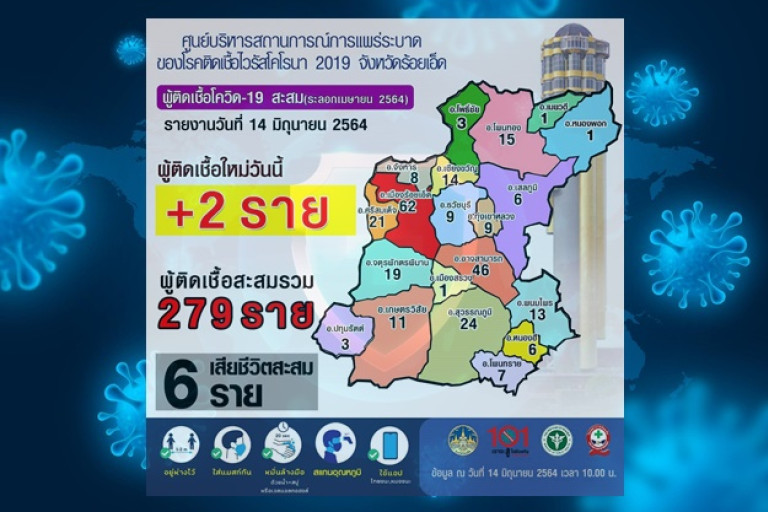 วันที่ 14 มิถุนายน 2564 สถานการณ์โรคโควิด-19 จังหวัดร้อยเอ็ด รักษาหายสะสม 259 ราย ยังคงรักษาตัวอยู่ในโรงพยาบาล 14 ราย เสียชีวิตสะสม 6 ราย วันนี้พบผู้ติดเชื้อโรคโควิด-19 เพิ่มขึ้น 2 ราย (ยอดติดเชื้อสะสมรวม 279 ราย) ดังนี้