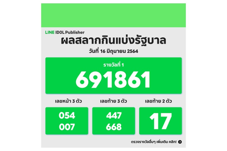 16 มิถุนายน 2564 15:56 น. สยามรัฐออนไลน์ วาไรตี้-โซเชียล ผลสลากกินแบ่งรัฐบาลงวดประจำวันที่ 16 มิถุนายน 2564 รางวัลที่ 1 : 691861 รางวัลเลขหน้า 3 ตัว : 054 , 007 รางวัลเลขท้าย 3 ตัว : 447,668 รางวัลเลขท้าย 2 ตัว : 17 ตรวจรางวัลอื่นๆคลิก https://lin.ee/hwmju6s/vjky/idol