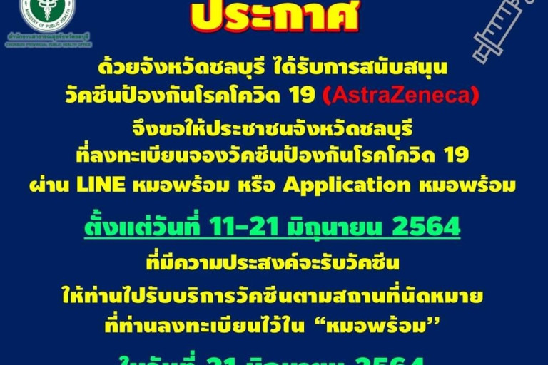 จึงขอให้ประชาชนจังหวัดชลบุรี ที่ลงทะเบียนจองวัคซีนป้องกันโรคโควิด 19 ผ่าน LINE หมอพร้อม หรือ Application หมอพร้อมตั้งแต่วันที่ 11-21 มิถุนายน 2564 ที่มีความประสงค์จะรับวัคซีน